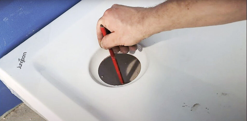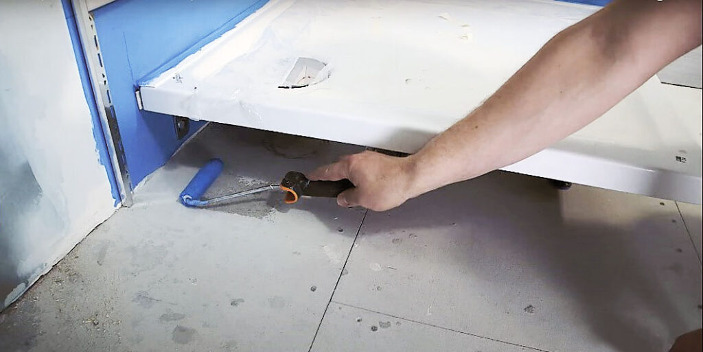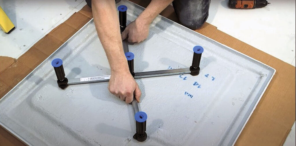 - Nožičky priskrutkujte k zosilnenému dnu a vaničku položte na zvolené miesto ku stenám. S použitím vodováhy vyrovnajte nastaviteľné nožičky a cez otvor na odtok si na podlahu vyznačte jeho umiestnenie