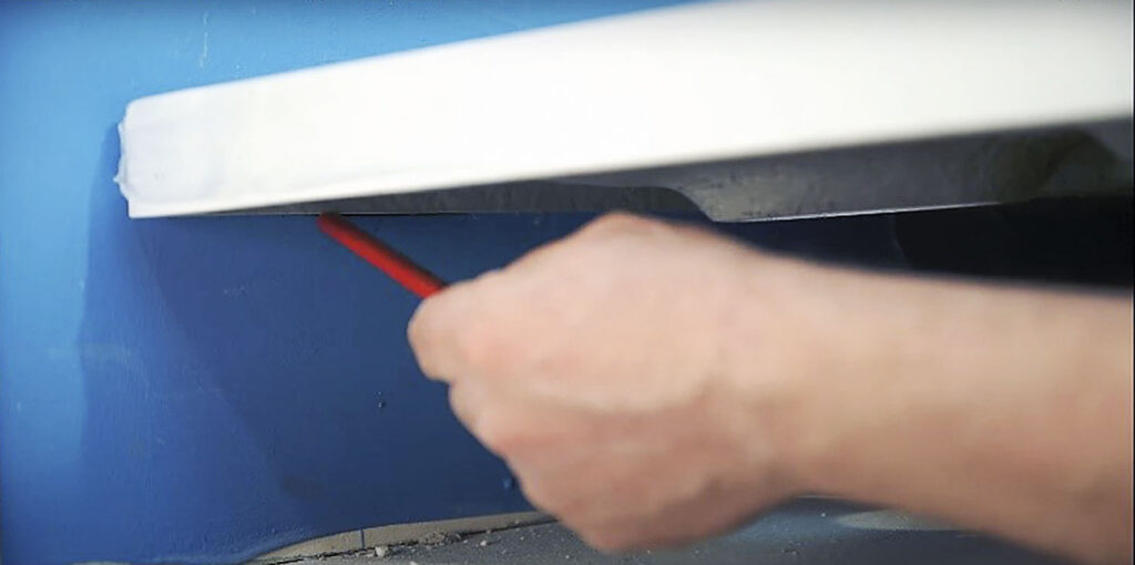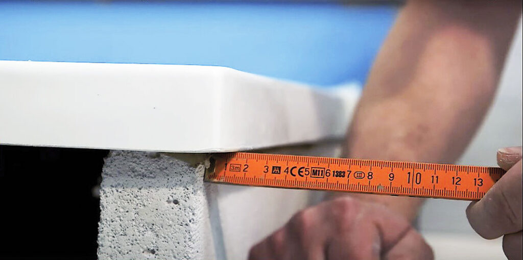 - Súčasne vyznačte rozmer spodného okraja vaničky na obidve steny. Každé vyznačenie vždy prekontrolujte vodováhou