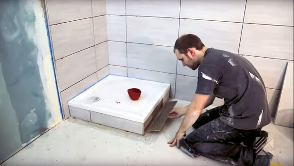 - Po obmurovaní a zaschnutí lepidla môžete naniesť obklady a položiť dlažbu. Začnite neobloženými stenami nad vaničkou. Na dlaždice naneste lepidlo na tvárnice – pri malých prírezoch na zadnú stranu dlaždice. Do škár zasaďte škárovacie krížiky alebo klinky. Ako ďalšia sa obloží sprchová vanička. Naneste lepidlo na pórobetónové tvárnice – pri malých prírezoch na zadnú stranu dlaždice. Použite hladiacu lyžicu s vhodným ozubením