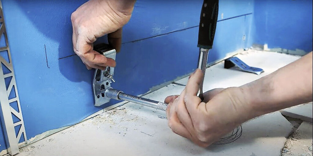- Vyvŕtajte diery pre lišty, vsaďte do nich hmoždinky a vyplňte ich sanitárnym silikónom. Následne namontujte stenové upevňovacie lišty, do ktorých môžete osadiť sprchový kút