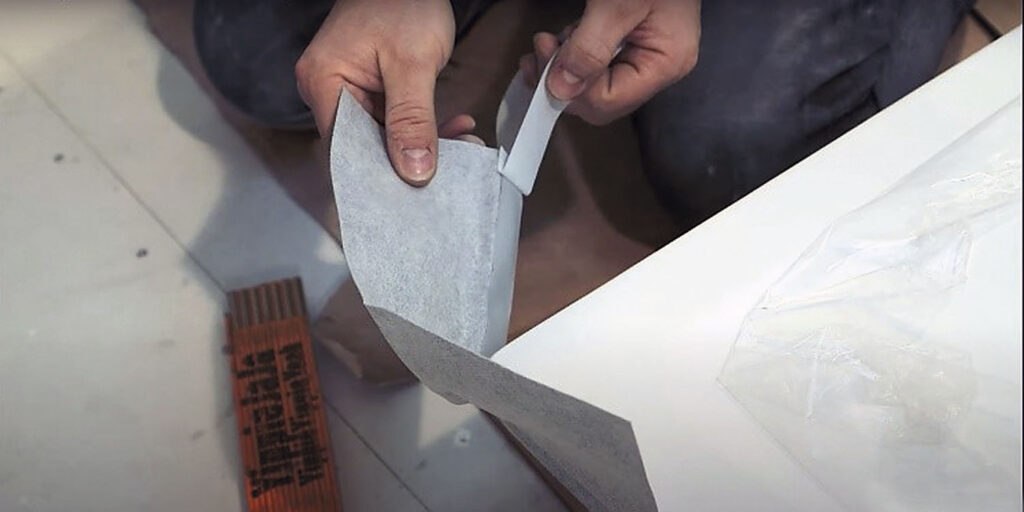 - Oblepte okraje vaničky tesniacou páskou. Tesniaca sada obsahuje špeciálne vytvarovaný tesniaci roh, ktorý sa ako prvý nanesie na roh okraja vaničky. Na úrovni tesniaceho rohu môžete naniesť prídavnú zvukovoizolačnú pásku