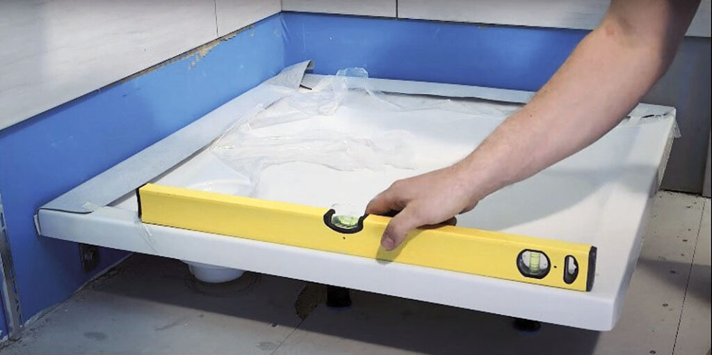 - Sprchovú vaničku postavte do finálnej polohy, vyrovnajte pomocou vodováhy a upevnite ju pomocou upínacích kusov
