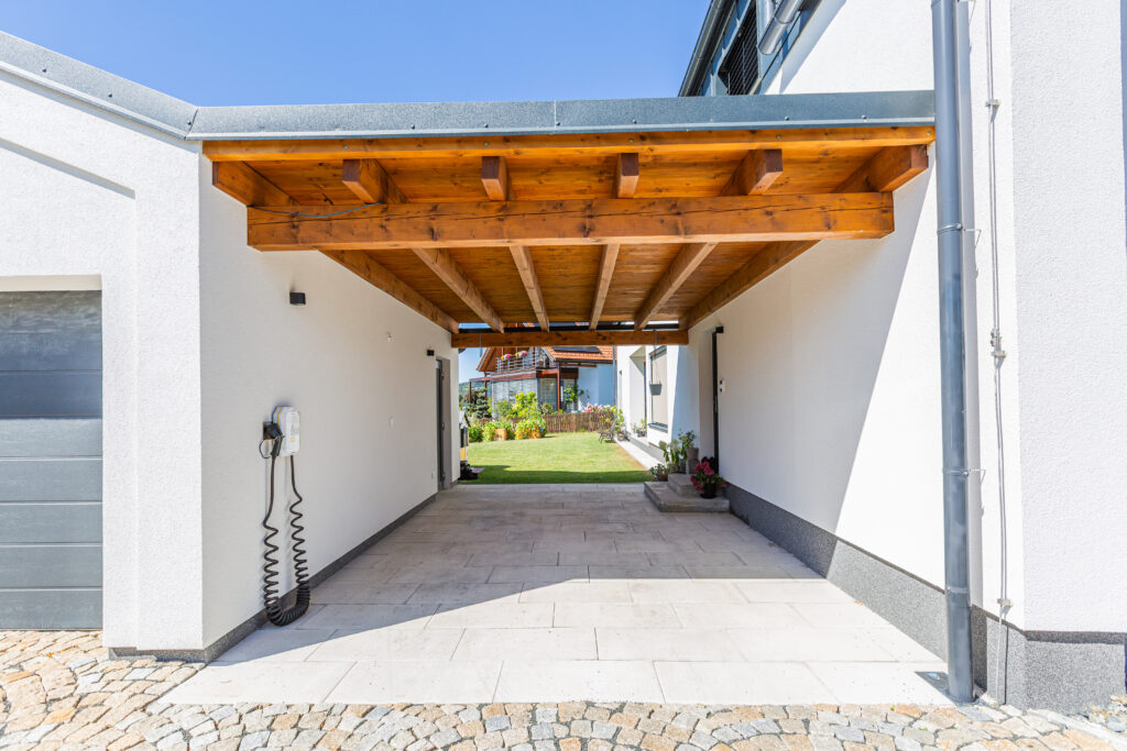 Moju ženu. Všetko pekné je dielom mojej ženy. Konštrukčne je presah riešený vymurovaním múrov a klasickým krovom, povrch je kompletne riešený omietkou. Uvažovalo sa o drevenom podbití, ale hovoril som žene, že ho natierať nebudem (smiech). Vikiere v podkroví sú obložené hliníkovým plechom.