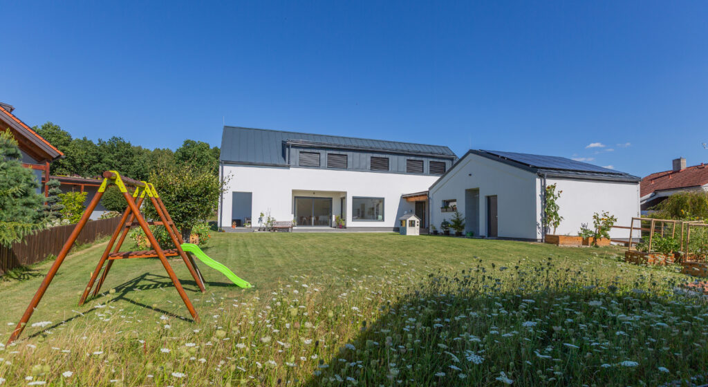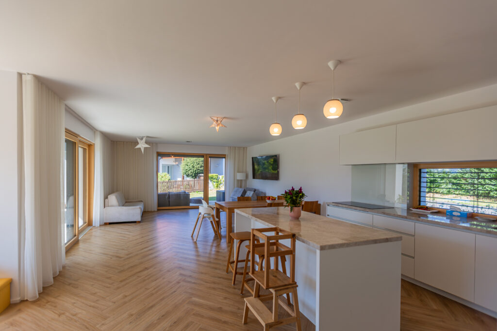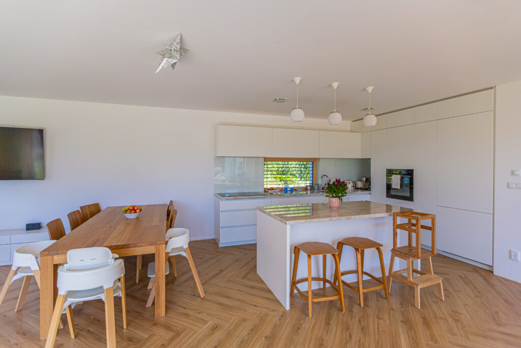 Na prízemí je hlavný obytný priestor s kuchyňou a jedálňou, potom pracovňa, kúpeľňa a technická miestnosť. V podkroví spálňa so šatníkom a kúpeľňou, tri detské izby a druhá kúpeľňa. A v jednej z detských izieb sme nechali urobiť prípravu na vodu, aby sa napríklad za pár rokov dal premeniť na kuchyňu a poschodie mohlo fungovať ako samostatná bytová jednotka. Nechcem to privolávať, ale vzhľadom na stále rastúce ceny nehnuteľností a nedostatok pozemkov možno naše deti nebudú mať takú možnosť, ako sme mali my, takže sme od začiatku chceli zaistiť možnosť dvojgeneračného bývania.