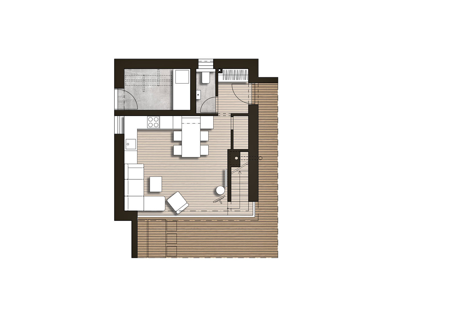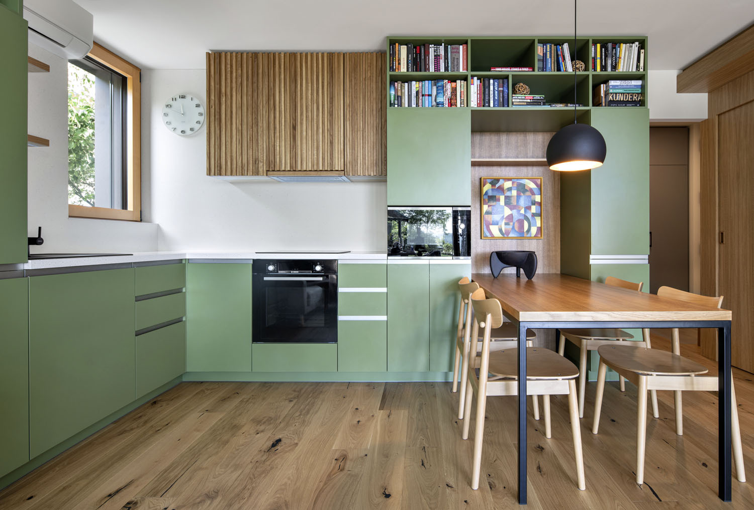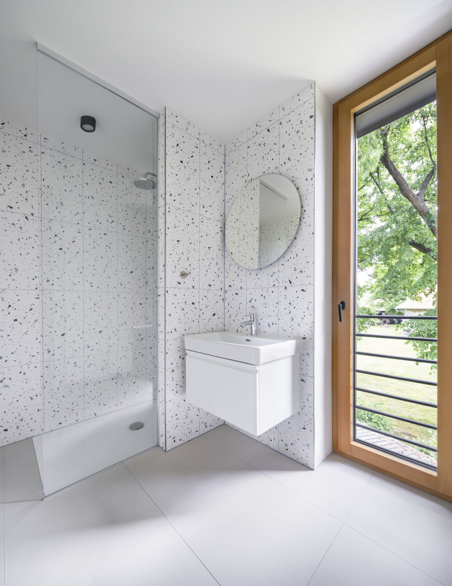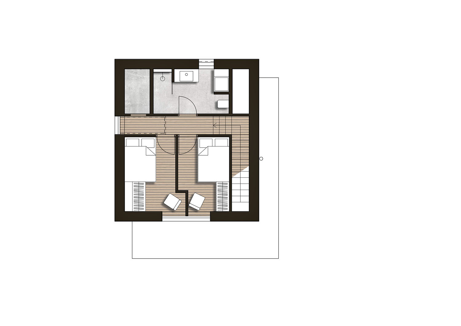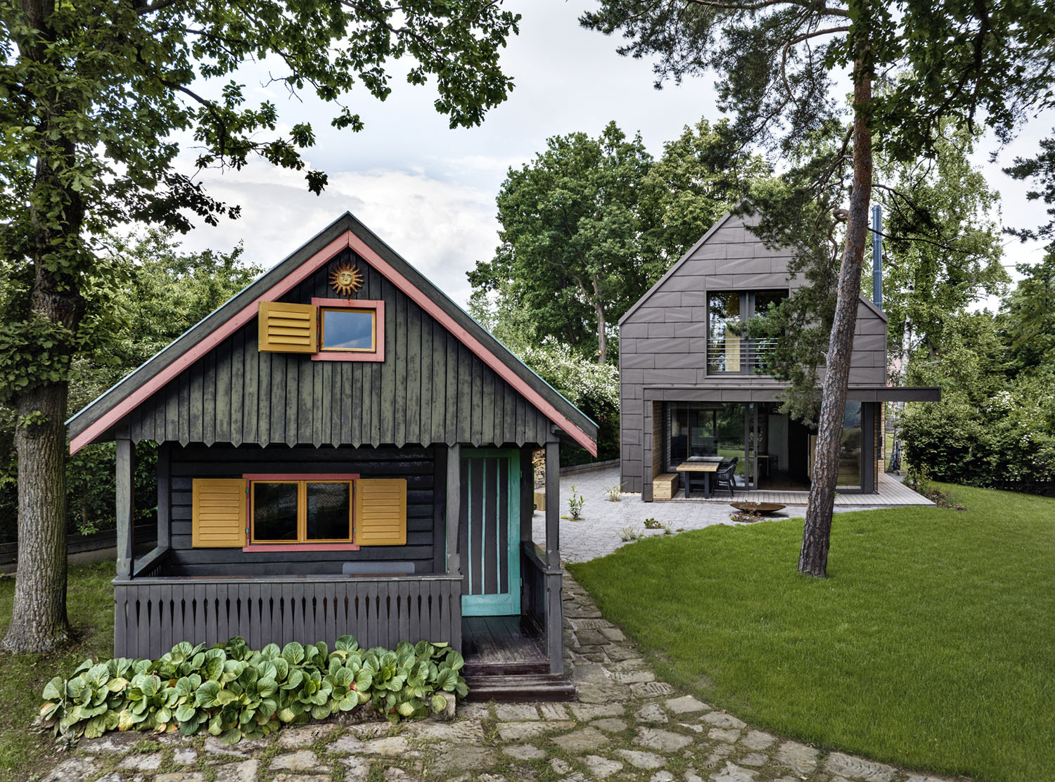„Archetypálnu podobu chaty sme zvolili s ohľadom na zástavbu okolitého prostredia a jej vertikalitou zdôrazňujeme kontrast medzi stabilitou zeme a slobodou neba.“ Súlad s prírodou podporujú sklené posuvné plochy, ktoré prepájajú obytnú časť interiéru s okolím a úžasne rozširujú aj pocit priestoru vo vnútri chaty. Veľké okná prinášajú nielen krásny výhľad, ale aj veľa svetla pre majiteľku, ktorá sa na svojej chate rada venuje maľbe. K rozprávkovej atmosfére prispieva aj ďalší domček na pozemku, ktorý pochádza z roku 1942. Aj ten majitelia zrekonštruovali a dnes slúži ako zázemie alebo môže poslúžiť napríklad na prespanie návštevy.