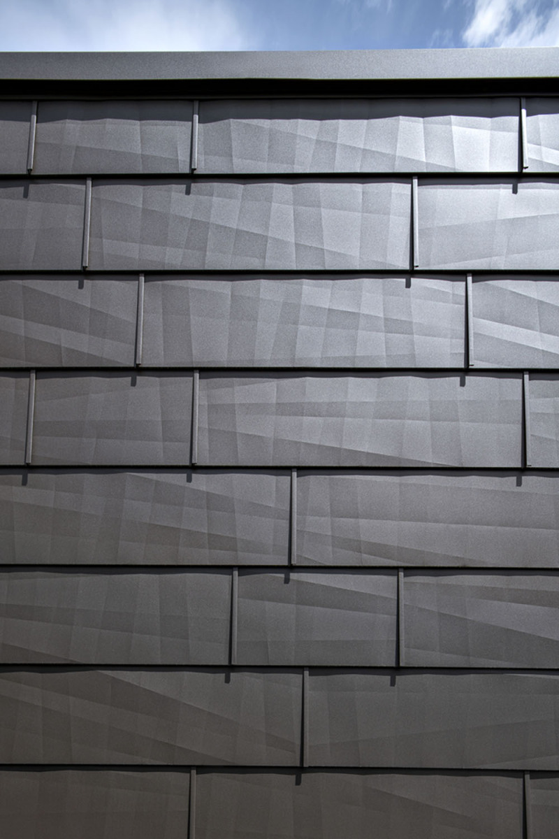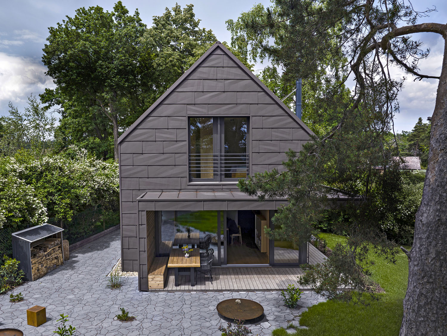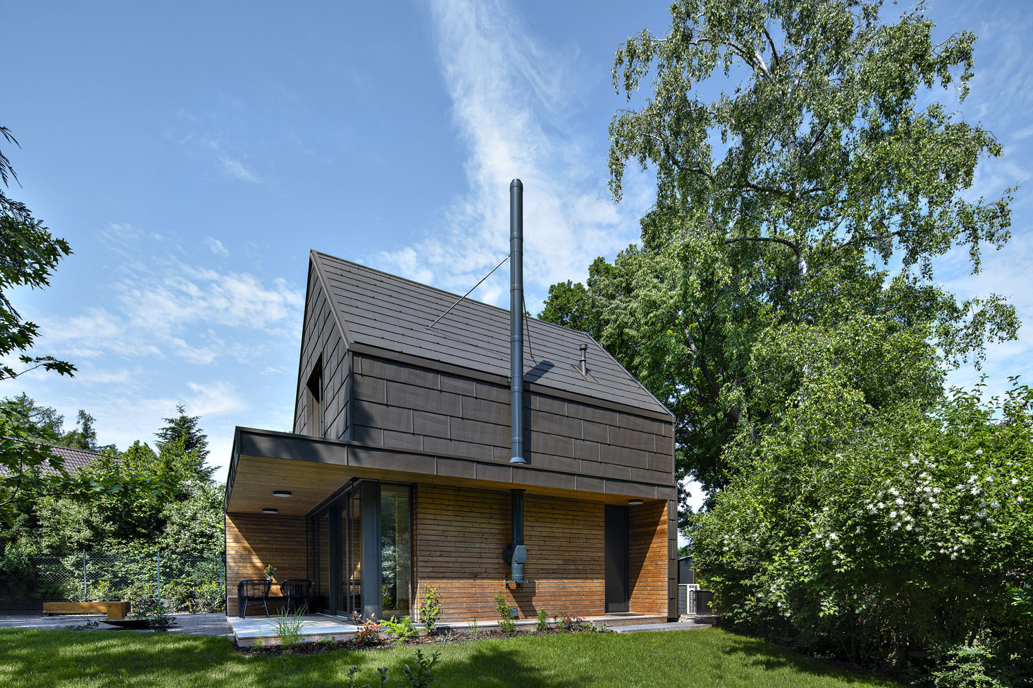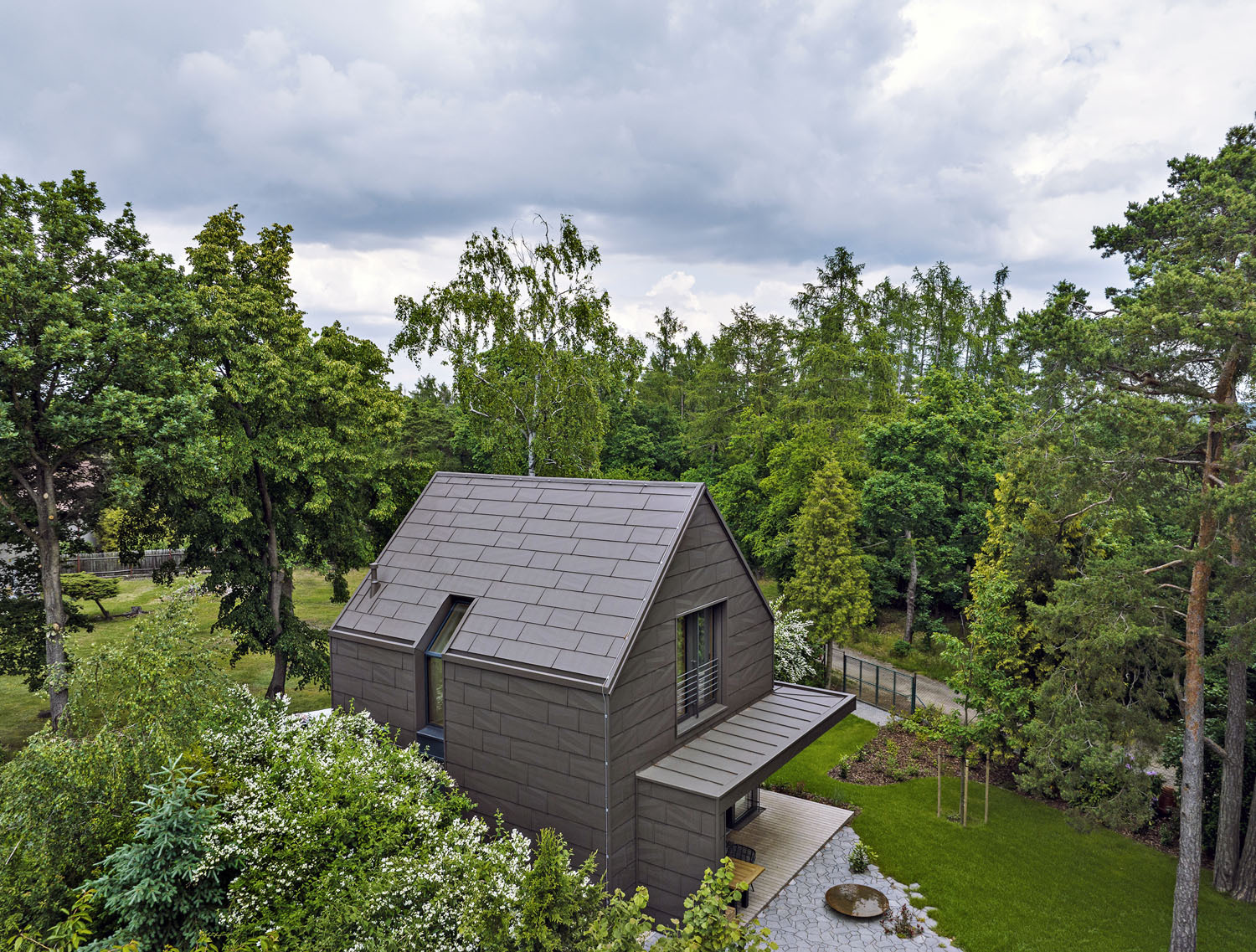 „Oblasť, kde stála pôvodná chata, má úplne unikátnu atmosféru. Na miesto nevedie pohodlná asfaltová cesta, ale vcelku poľná cesta, ktorá už sama o sebe premieňa vnímanie. Ďalej od starostí veľkomesta, bližšie k prírode, prepíname na iný režim,“ spomínajú architekti na prvé zoznámenie sa s miestom realizácie. „V okolí sú nádherné vysoké borovice, ktoré nás očarili a ktorých vzor sa odráža na fasáde. Tú tvoria tmavohnedé hliníkové šablóny a svojím tvarom pripomína šišku. Hliníkový povrch fasády zaručuje ľahkú údržbu a dlhú životnosť a napĺňa zásadnú požiadavku na praktickosť.“ Konštrukčne bola novostavba pojatá ako drevostavba. Drevený obklad bol použitý v zatienených častiach či pri podbití a strecha bez odkvapov obmedzila nutnosť čistenia. „Zvolili sme tmavú farebnosť, aby sme potlačili vizuálny zásah pre okolie,“ vysvetľujú architekti.