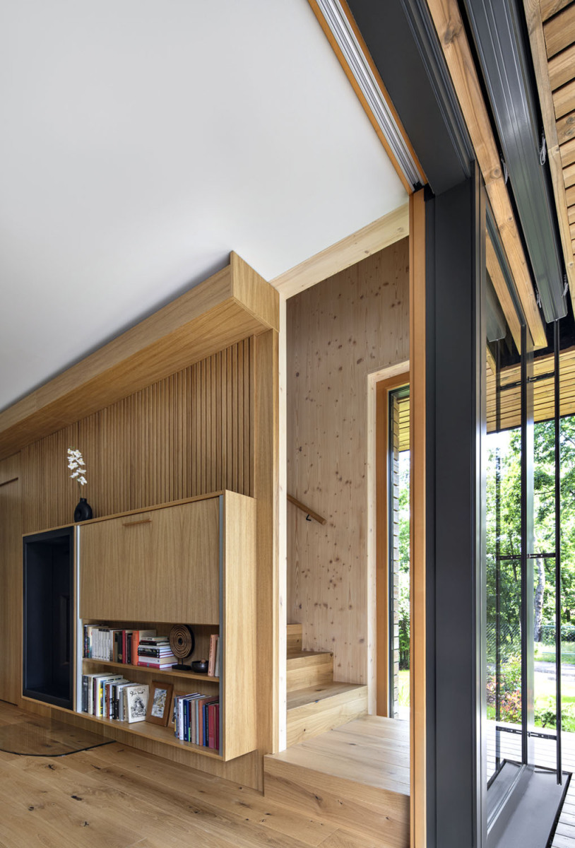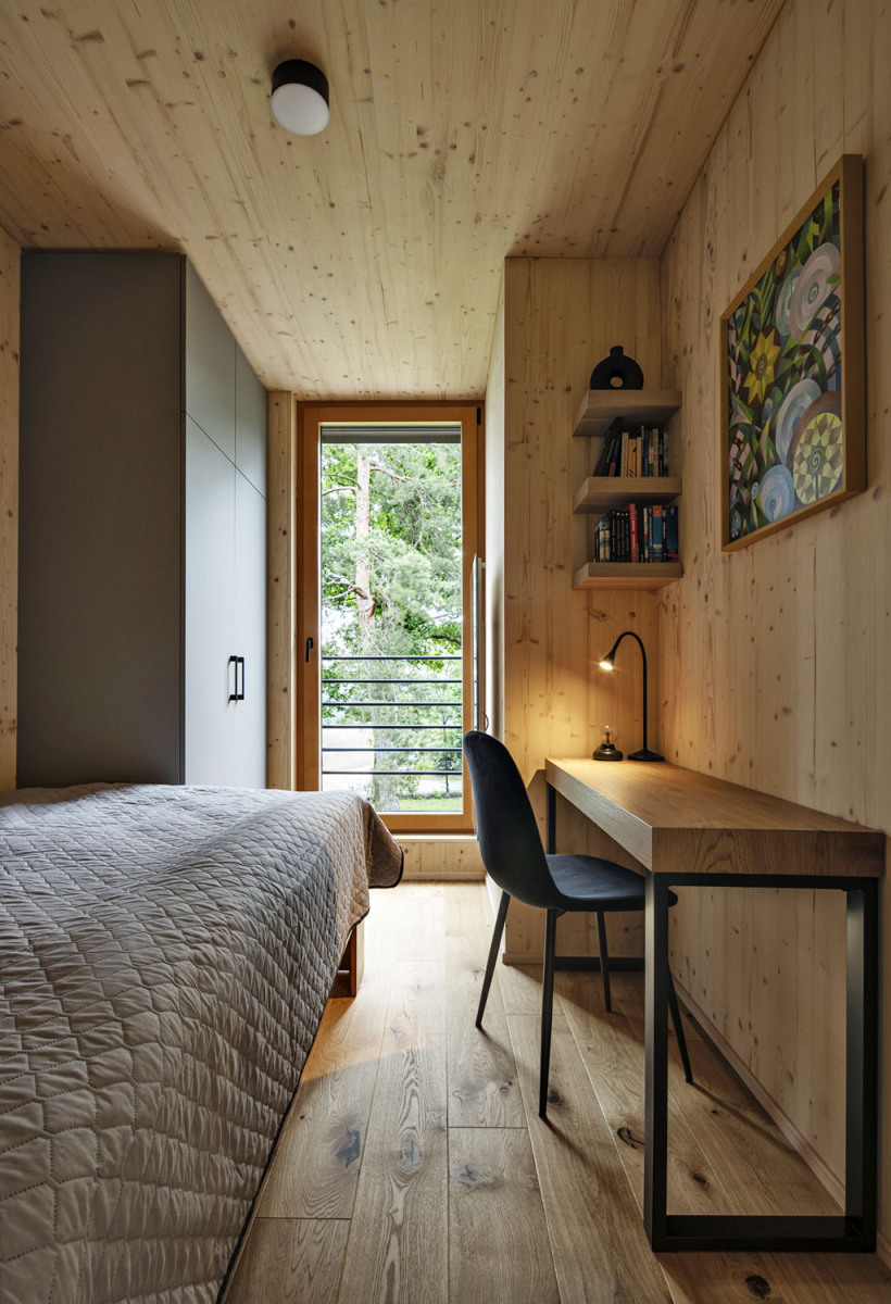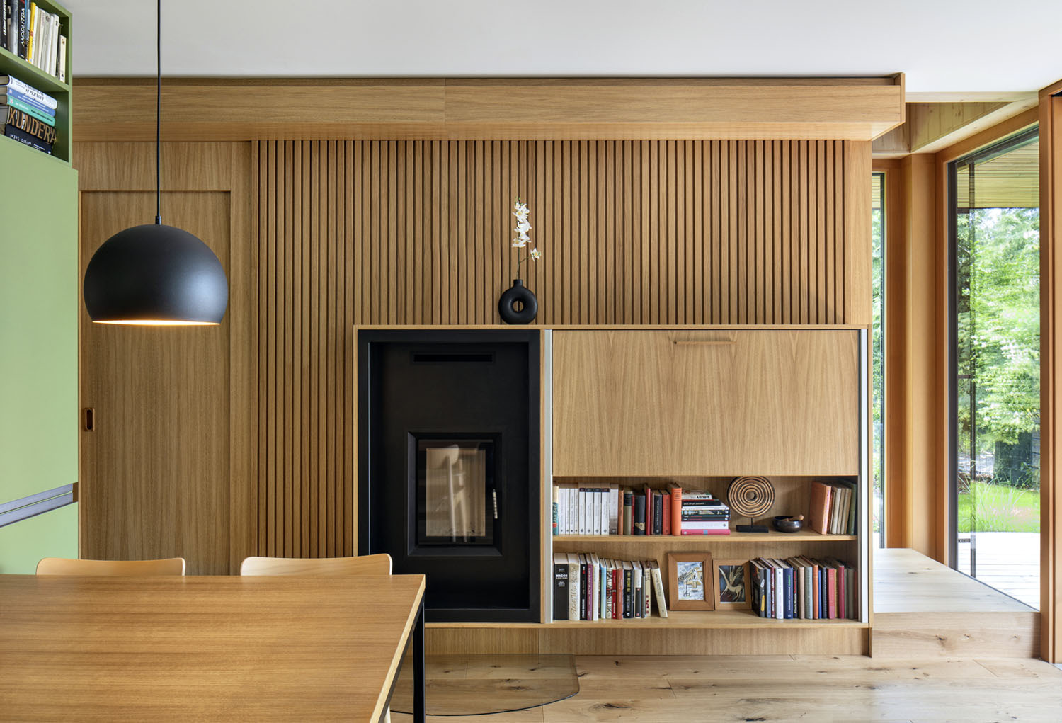 Cieľom zadania bolo vytvoriť priestor, ktorý vyžaruje útulnosť a teplo domova. Preto bol v interiéri hojne využitý dub, konkrétne na podlahy, stenu s krbom, jedálenský stôl a stoličky. V spálni a na schodisku zostali viditeľné konštrukčné CLT panely zo smrekového dreva. Tento prírodný materiál prináša do interiéru teplý dojem domova a ušetrí náklady na obklady. CLT panely majú výhody aj v statických vlastnostiach – malá konštrukčná hĺbka umožňuje veľké rozpony a má vysokú únosnosť. Ich malá hrúbka spolu s dobrou tepelnou izoláciou vedie k priestrannejšiemu interiéru. Stavbu kompletne projektovala a realizovala firma 3AE, špecializovaná na drevostavby z masívnych panelov z dreva.