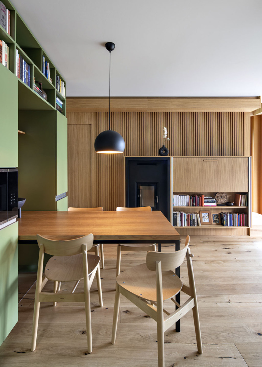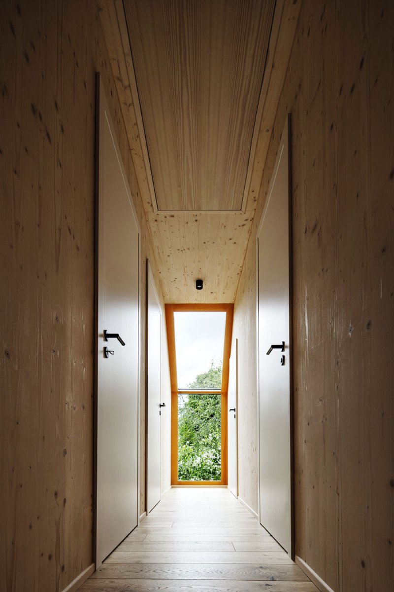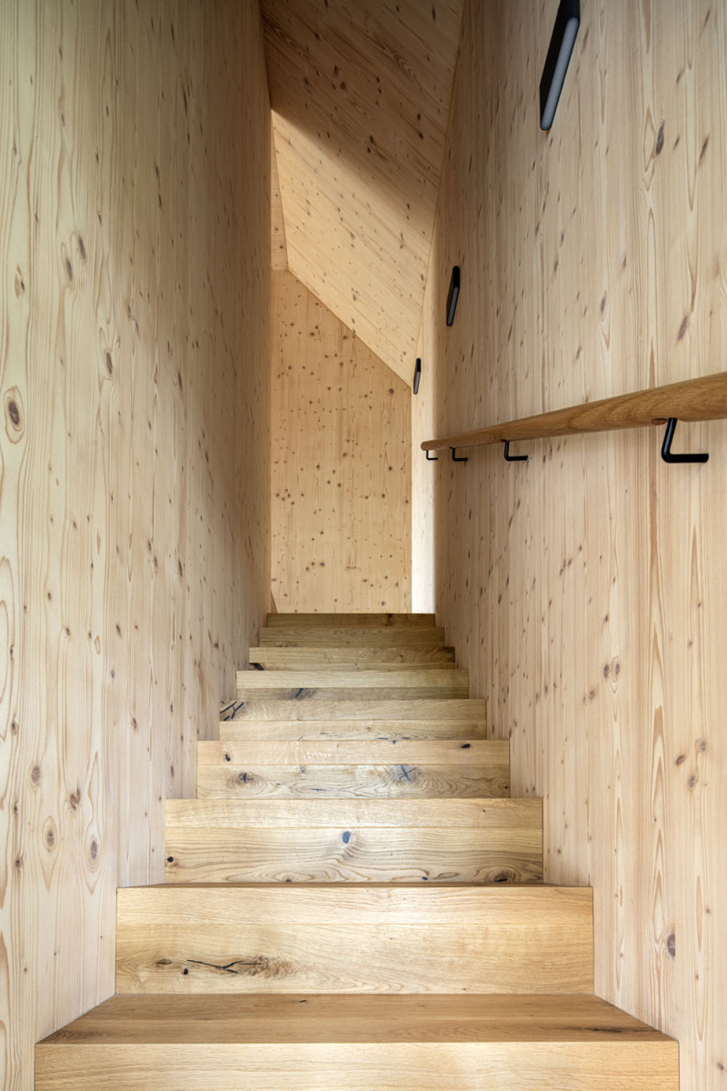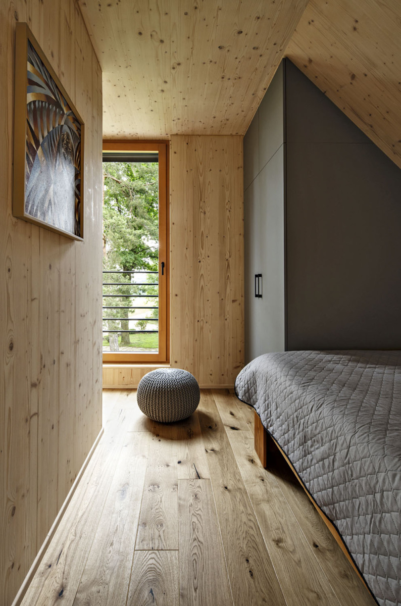 Cieľom zadania bolo vytvoriť priestor, ktorý vyžaruje útulnosť a teplo domova. Preto bol v interiéri hojne využitý dub, konkrétne na podlahy, stenu s krbom, jedálenský stôl a stoličky. V spálni a na schodisku zostali viditeľné konštrukčné CLT panely zo smrekového dreva. Tento prírodný materiál prináša do interiéru teplý dojem domova a ušetrí náklady na obklady. CLT panely majú výhody aj v statických vlastnostiach – malá konštrukčná hĺbka umožňuje veľké rozpony a má vysokú únosnosť. Ich malá hrúbka spolu s dobrou tepelnou izoláciou vedie k priestrannejšiemu interiéru. Stavbu kompletne projektovala a realizovala firma 3AE, špecializovaná na drevostavby z masívnych panelov z dreva.