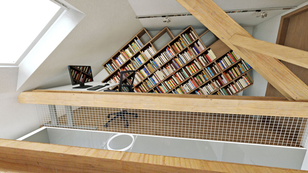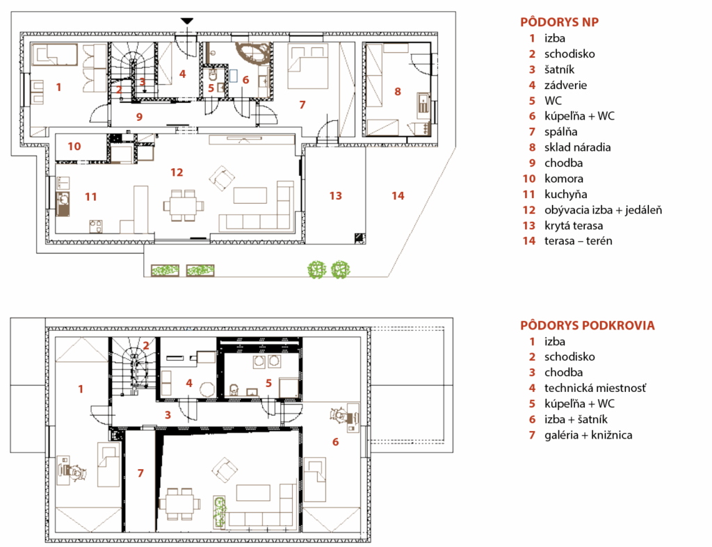 Dispozičné riešenie domu vychádza z orientácie pozemku voči svetovým stranám. Srdcom domu je obývacia izba s kuchyňou, tento priestor má veľkoryso otvorený strop – vytvára galériu až do druhého nadzemného podlažia, kde je umiestnená malá knižnica, ktorá zároveň slúži ako pracovňa. Zo srdca domu je prístup na terasu a záhradu. Spálne rodičov a detí sú na prízemí a hornom podlaží za chodbou, ktorá delí dennú a nočnú časť domu. Do budúcna sa počíta s malou vonkajšou kuchynkou k terase, zázemie pre ňu je na východnej strane domu v samostatnej miestnosti.