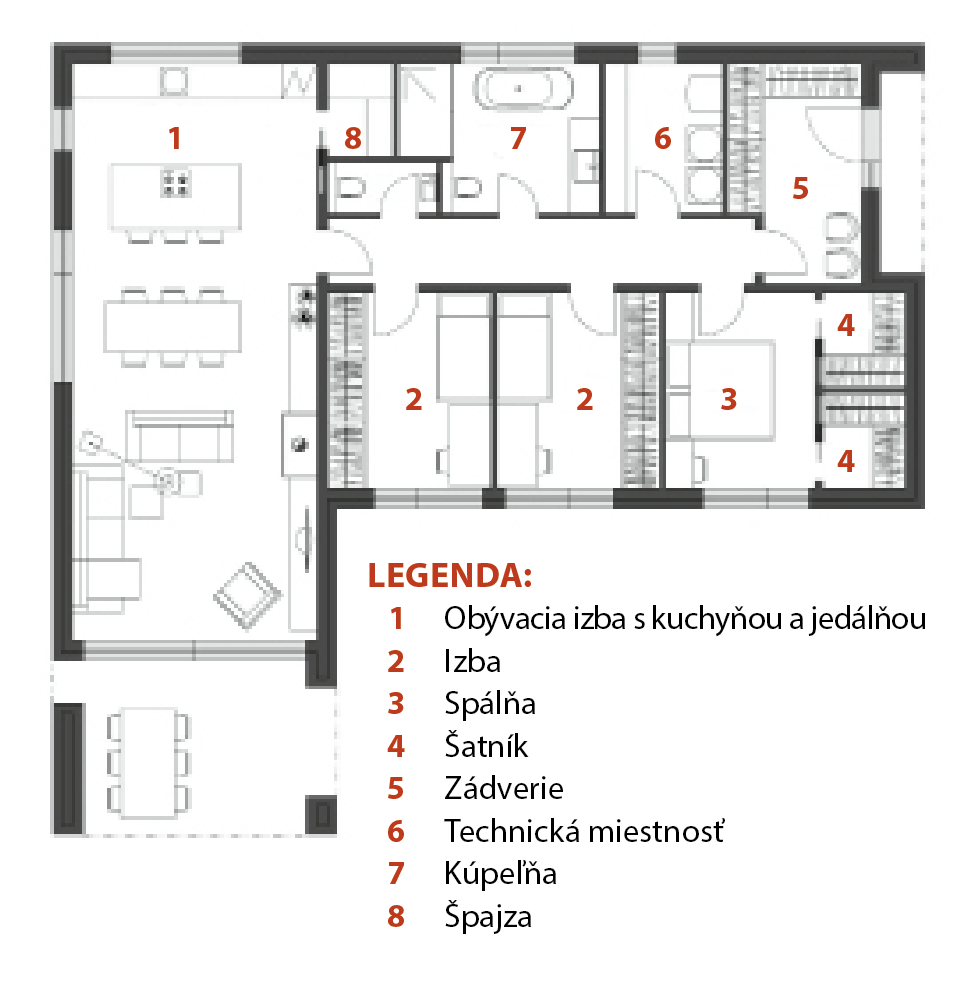 Jednopodlažný dom s dispozíciou 4 + kk je veľmi zaujímavo riešený. Spoločný priestor obývacej izby, kuchyne a jedálne a ďalšie tri izby disponujú priamym vstupom do záhrady. Nechýba tu priestranné zádverie s úložným systémom a špajza. Praktické sú aj dve samostatné šatne pri spálni rodičov. Ďalej sú súčasťou domu, samozrejme, kúpeľňa a WC + technická miestnosť. Odvážne riešený interiér s dizajnovými prvkami a otvorením priestoru do krovu a sčasti zastrešenou terasou je už len čerešničkou na torte, rovnako ako pokročilé technológie pre vykurovanie: podlahový systém Rehau, tepelné čerpadlo IVT a rekuperácia Zehnder.