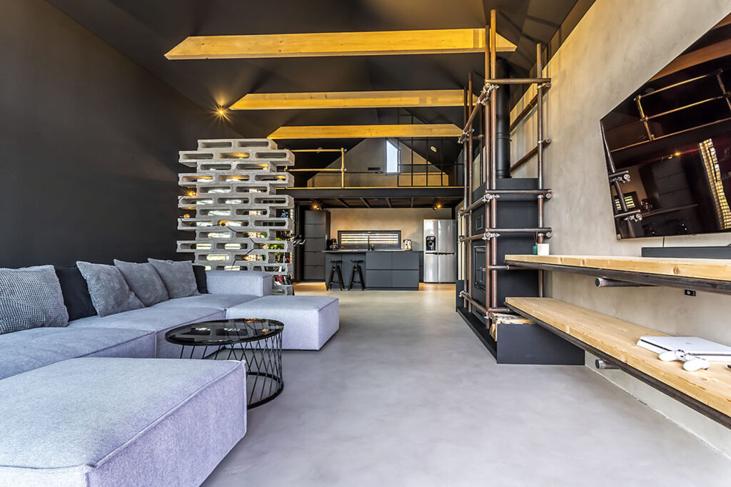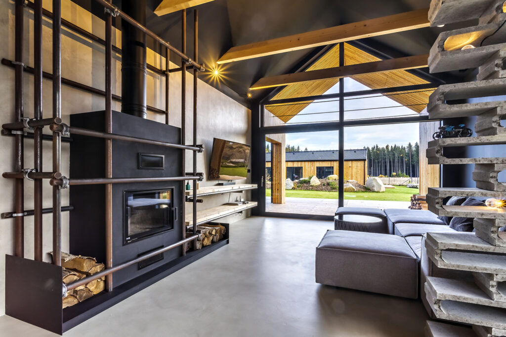 Mohutný kovový krb, zásobník na drevo z kovových rúrok, betónové police – dalo by sa hovoriť o industriálnom štýle, drevené prvky a pohodlná sedačka však vnášajú do interiéru útulnosť