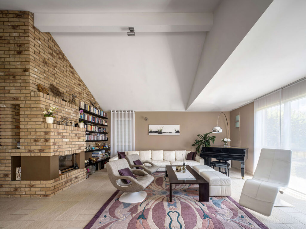 „S interiérom nám pred nasťahovaním pomáhal architekt Mojmír Raný. Dali sme teda dosť na jeho odporúčania. Previesť vonkajšie tehlové obloženie aj do interiéru bol jeho nápad. Skombinovali sme ho tu s ďalšími materiálmi vrátane koženej sedacej súpravy a dizajnových kresielok, ktoré mali pôvodne ružovú farbu, ale nedávno sme ich nechali prečalúniť,“ popisuje Gabriela a dodáva: „Ja vlastne nemám zvlášť veľkú potrebu obklopovať sa drahými umeleckými predmetmi, takže ich tu od tej doby veľmi nepribudlo. Chcem, aby bol dom útulný a je pre mňa dôležitejšie, s kým tam som, než veci okolo.“