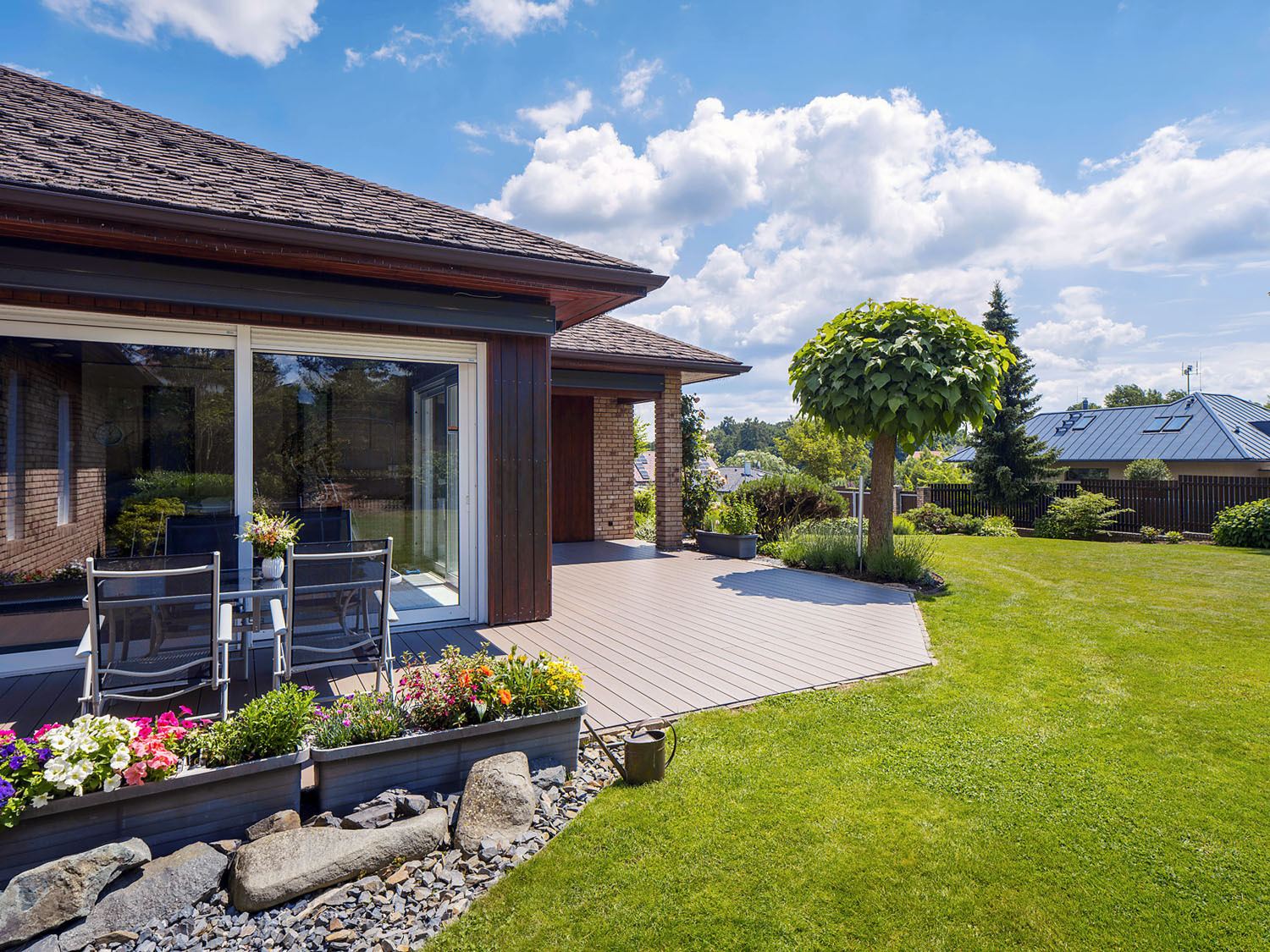 „U Garbiely Partyšovej sme realizovali 42 m2 terasy Twinson radu Majestic Massive Pro v odtieni (519) rustikálny dub. Terasa má na povrchu tenkú vrstvu PVC, takže je naozaj celkom bezúdržbová, nezostávajú na nej žiadne mastné škvrny od opaľovacieho krému alebo z grilovania. Impregnácia proti hnilobe a škodcom, olejovanie alebo dokonca brúsenie povrchu tiež úplne odpadá. Vďaka mimoriadnej odolnosti terasy na ňu dávame záruku 25 rokov, “ dopĺňa Petr Klaban, technický a produktový manažér belgického výrobcu Deceuninck. Často využívaná terasa tu funguje ako predĺženie interiéru a pohodlný vstup do exteriéru, do prírody – hneď za plotom je les. Záhrada má plochu 3 700 m2 a patrí k nej i tenisový kurt. Okrem potôčika, krásnej katalpy, hortenzií a popínavej ruže, ktorá je pýchou Gabrielinej mamičky, tu nájdeme i skutočnú raritu – niekoľko urastených sekvojí! Zasadili ich tu tesne po dostavbe domu ako metrové stromčeky a dnes budú mať už isto desať metrov. V našich zemepisných šírkach dosť neobvyklý úkaz.