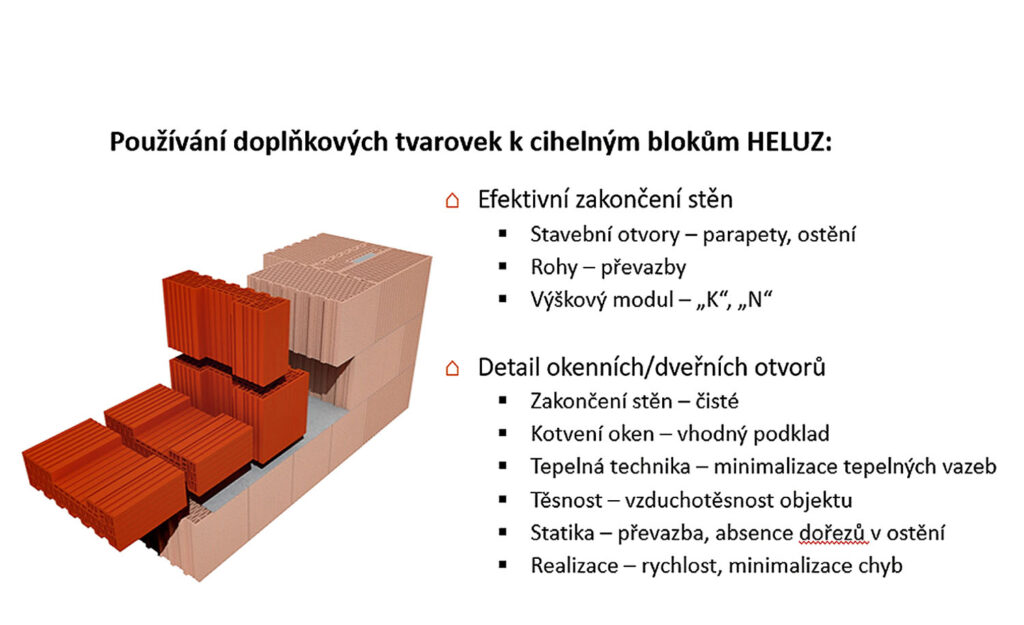DOBRÁ RADA – Ing. Zdenek Kobza, produktový špecialista spoločnosti HELUZ: Navrhovať a stavať v tehlovom systéme HELUZ je jednoduché a ľahké. Projektant má všetky materiály na výstavbu od jedného výrobcu a má výbornú technickú podporu. Systémové stavanie nie sú iba základné tehly! Každý skúsený projektant vie, že projektovať vo výrobných moduloch a používať na stavbe celý systém doplnkových tehál je výhodné z hľadiska rýchlosti, kvality murovania a bezproblémového vyriešenia detailu. Používanie doplnkových tehál umožňuje napríklad využívať výhody modulového radu 25, čo sa týka výšky aj dĺžky.