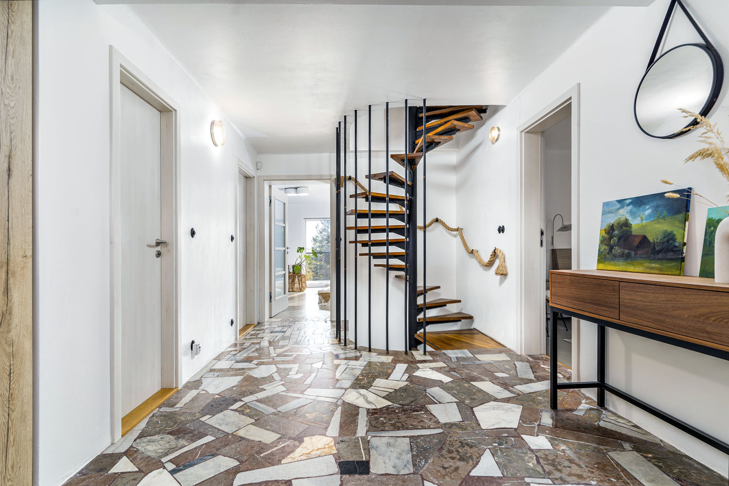 Pôvodný žulový suterén, ktorý tvoril sokel chaty, zostal zachovaný, bol upravený a novo zariadený. Teraz je tu kuchyňa a priestranná jedáleň s impozantným dubovým jedálenským stolom, ktorý slúži zároveň ako biliardový. Jeho špeciálna krycia doska sa dá navyše upraviť aj pre hru stolného tenisu. Samozrejme, nesmeli chýbať kachle – majitelia si vybrali moderný nórsky dizajn. Prízemie postavené z tehál bolo zateplené minerálne vatou. Je rozčlenené na širokú chodbu s pôvodnou asymetrickou dlažbou, spálňu rodičov, veľkú obývaciu izba a kúpeľňu. Izby sú pojaté vo farebne striedmom, neutrálnom štýle v tlmenej harmónii odtieňov bielej, sivej a čiernej. Útulnosť im dodáva využitie drevených komponentov a originálnych doplnkov podľa vzoru škandinávskych interiérov. Obývacej izbe dominuje veľkoformátová sklenená posuvná stena, ktorá zaisťuje priamy kontakt s prírodou. Posuvné dvere Vekra sa vyznačujú vlastnosťami zhodnými s oknami. Teplo a pohodlie pre dokonalú atmosféru zimných večerov zaisťuje aj mohutné pôvodné krbové teleso, umiestnené pozdĺž bočnej steny obývacej izby. Je z oboch strán obložené surovou žulou a vybavené praktickým výklenkom na uloženie dreva. „Na stene za kozubom je originálny starý keramický obklad, ktorý sme natreli sivou farbou. Pred ním sú položené moderné keramické dlaždice s dekórom terrazzo,“ hovorí majiteľka a pokračuje: „Kozub zostal v pôvodnom stave, vykonali sme v ňom ale malú modernizáciu. V rámci rekonštrukcie bolo urobené nové vyvložkovanie komína a teraz v ňom možno zakúriť pre efekt plynom.“ Na prízemí zostalo zachované aj pôvodné točité schodisko. Celá podkrovná nadstavba bola riešená ako drevostavba, aby príliš nezaťažovala spodné podlažie, a navyše vytvára príjemnú vnútornú klímu.