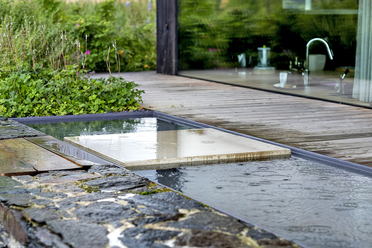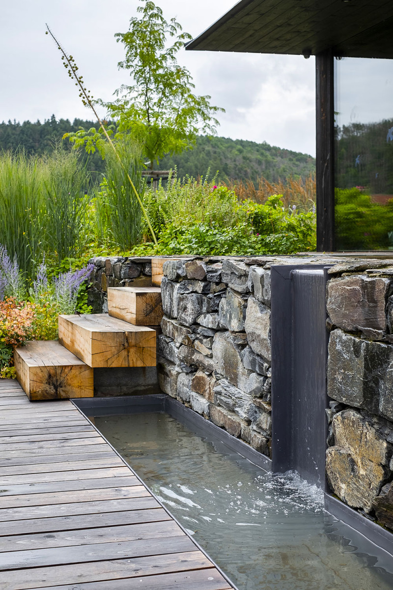 Mierne svahovitý pozemok s rozlohou zhruba 2 500 m² nájdeme v chatovej kolónii nad meandrom rieky pri priehrade. Dom má moderný charakter, ktorý zapadá do okolitého prírodného prostredia a inšpiroval architektov k rovnakému konceptu záhrady. „Chceli sme tráviť čas niekde blízko vody a lesov, pretože radi jazdíme na bicykloch a na kajakoch. Práve vďaka lodiam sme objavili aj kút polostrova, v ktorom sme vtedy náhodne zakotvili,“ hovoria majitelia.