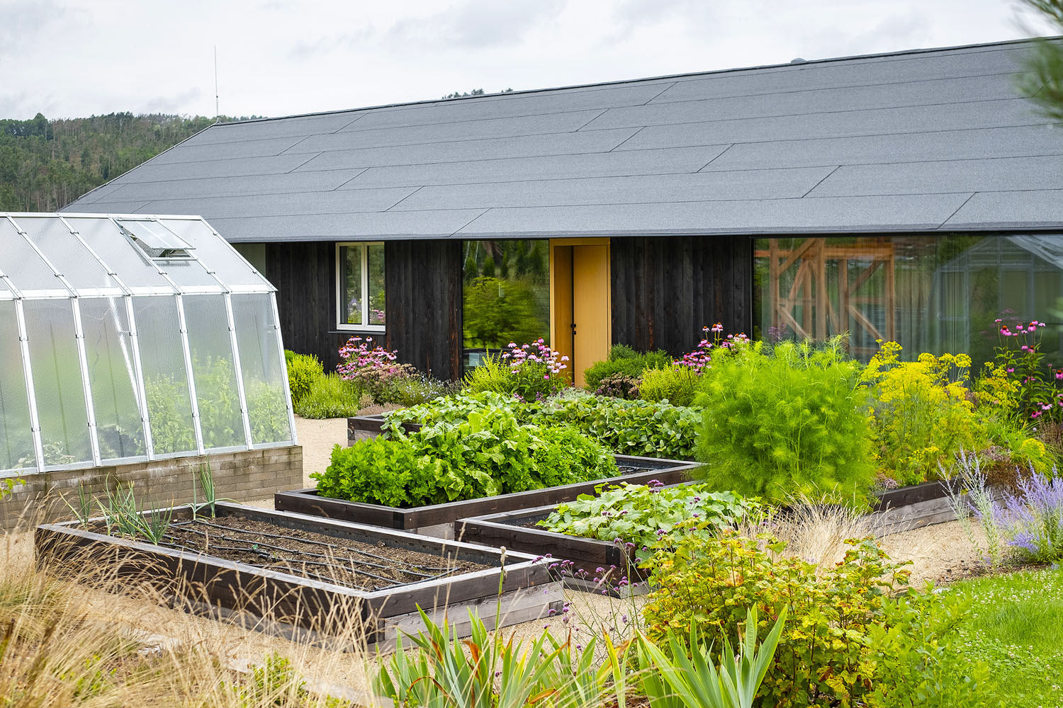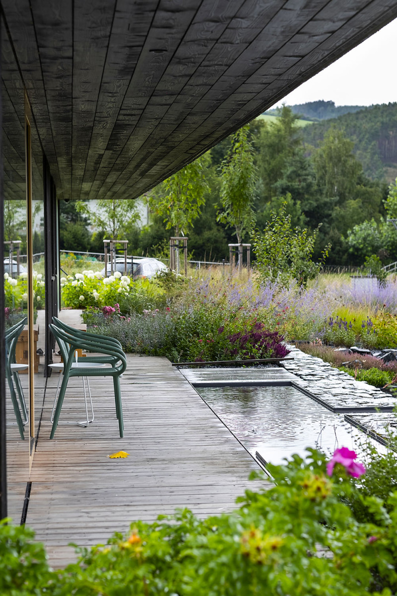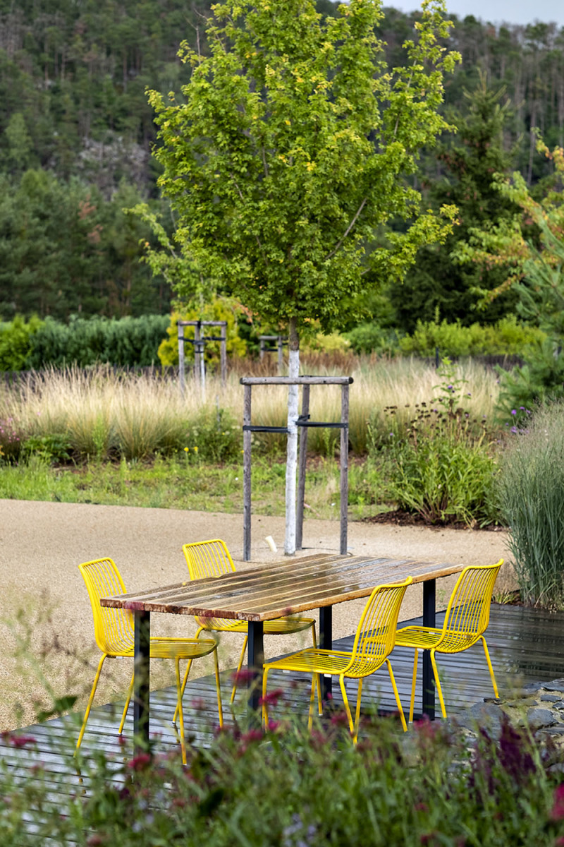 V záhrade nájdeme len jednu malú plochu udržiavaného trávnika, ktorý majitelia využívajú pre chôdzu bosou nohou. Hlavná pobytová plocha je mlatová, ukrytá v príjemnom tieni stromov. Na hlavnú pobytovú plochu nadväzuje lúka/kvetnatý trávnik, ktorý sa kosí iba niekoľkokrát ročne, čím v mieste podporuje biodiverzitu. V zadnej časti záhrady bola ponechaná pôvodná vegetácia – lúka – pri stavbe to bola bezzásahová zóna. „Medzi kvetmi sa prelínajú pôvodne prírodné druhy (margaréty, rebríčky, sasanky, kohútiky…) s tými tradičnými z vidieckych záhradiek (ľaliovky, floxy, ruže, pivonky…). Trvalkové záhony pri dome sme namiešali z byliniek a vidieckych kvetov“, dopĺňa spoluautorka projektu Kateřina Svobodová.