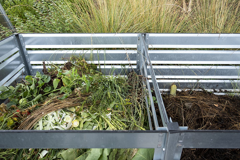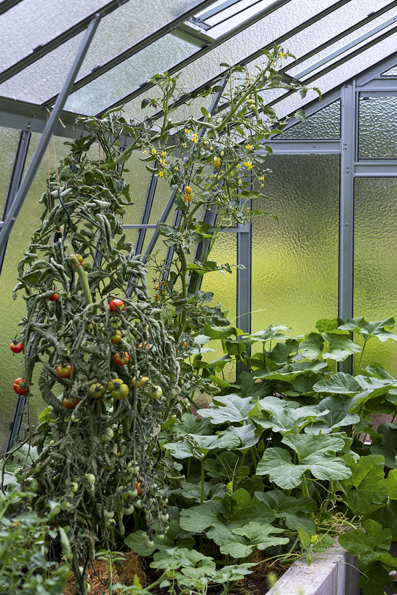 Vo vstupnej časti je umiestnená zeleninová záhrada veľkorysých rozmerov, ktorá zaisťuje čiastočnú potravinovú sebestačnosť celé vegetačné obdobie. Tvoria ju vyvýšené záhony a skleník. Zeleninová záhrada je od vchodu oddelená záhonom s bylinkami a aromatickými rastlinami, ktorý je zavlažovaný dažďovou vodou priamo zo strechy. Vodný prvok, ktorý je súčasťou terasy pri dome, slúži ako ochladzovacia vaňa k saune, ktorá je umiestnená hneď vedľa v dome. Ďalšími prvkami v záhrade sú vonkajšia posilňovňa, ohnisko a kôlňa so sušiakom na bielizeň.