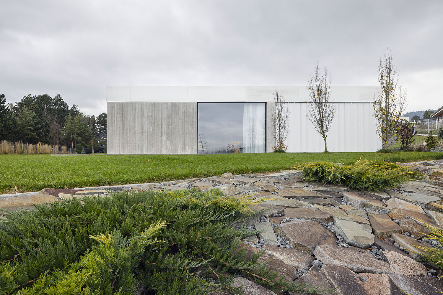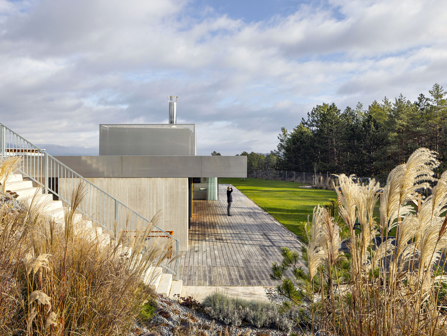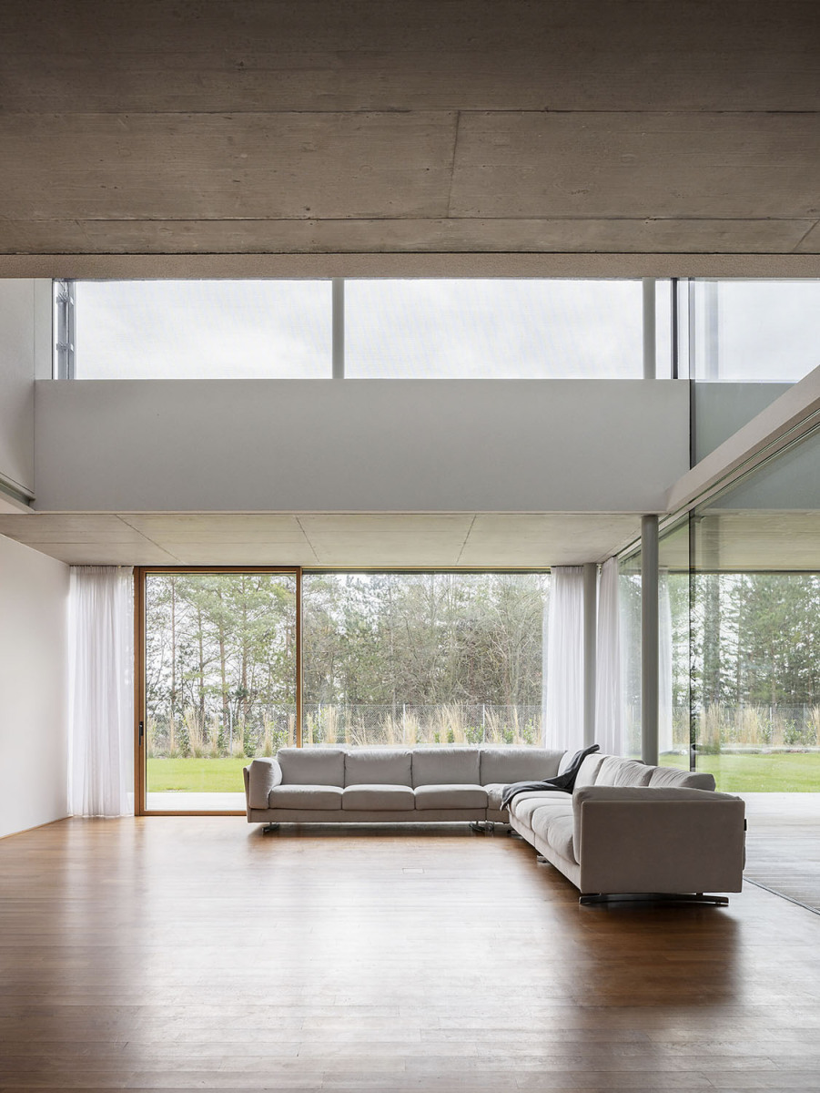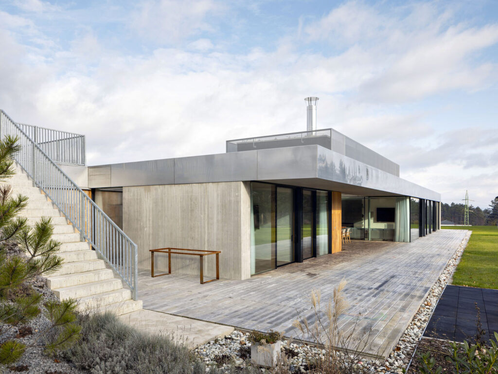 Stavba sa nenásilne napája na svahovitý terénny reliéf, ktorý ju z dvoch strán objíma a chráni a otvára sa na slnečný juhovýchod. „Kompozične stavbe dominuje horizontála, s orientáciou presklených stien na obytnú terasu s výhľadom na les,“ pokračuje architekt. „Rozhranie medzi terasou a interiérom nie je lineárne, v obytnej hale sme vytvorili pravouhlý meander vstupujúci dovnútra do domu. Obytná časť terasy je zapustená hlbšie do centra stavby, poskytuje maximálne súkromie a využíva sa ako plnohodnotná letná kuchyňa s jedálenským stolom a sedacou súpravou.“ Exteriér je materiálovo zjednotený s interiérom prostredníctvom surového povrchu pohľadového betónu, do ktorého je vtlačená stopa každej praskliny či inej nerovnosti dreveného debnenia. Takáto textúra dáva stavbe autenticitu a rozpráva jej príbeh. Neutrálne sivé plochy korigujú svojimi červenkastými tónmi drevenú tíkovú podlahu, dvere a drevené obklady stien. Ďalšími farebnými a materiálovými komponentmi sú hladké biele omietky, sklo a nábytkové solitéry vo svetlosivej a čiernej farbe. Neutrálne čisto funkčný dizajn odráža životný štýl rodiny, prístup k bývaniu a tiež sa podvoľuje tomu, čo je v dome hlavné – výhľad do lesa a bohatý spoločný život rodiny.