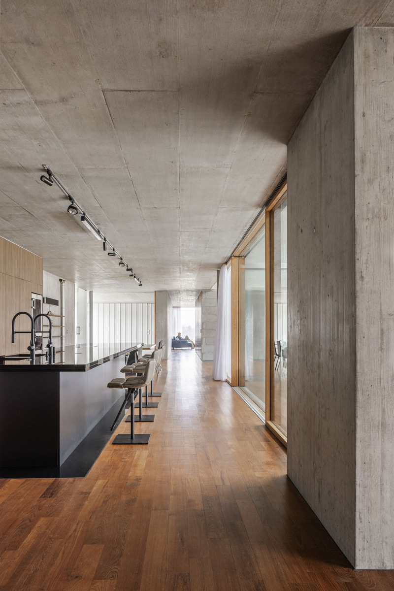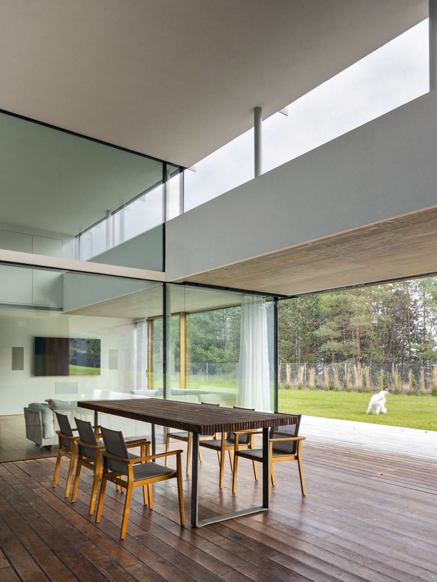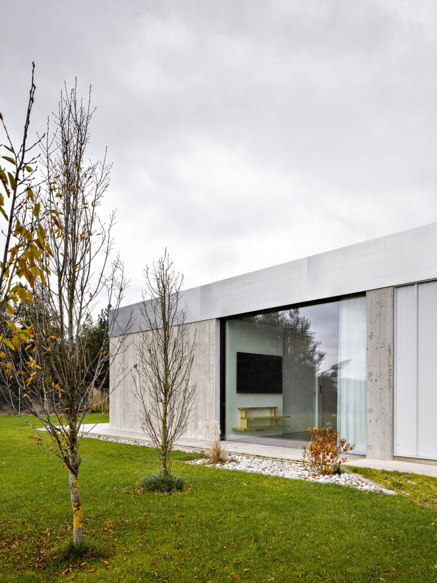 Stavba sa nenásilne napája na svahovitý terénny reliéf, ktorý ju z dvoch strán objíma a chráni a otvára sa na slnečný juhovýchod. „Kompozične stavbe dominuje horizontála, s orientáciou presklených stien na obytnú terasu s výhľadom na les,“ pokračuje architekt. „Rozhranie medzi terasou a interiérom nie je lineárne, v obytnej hale sme vytvorili pravouhlý meander vstupujúci dovnútra do domu. Obytná časť terasy je zapustená hlbšie do centra stavby, poskytuje maximálne súkromie a využíva sa ako plnohodnotná letná kuchyňa s jedálenským stolom a sedacou súpravou.“ Exteriér je materiálovo zjednotený s interiérom prostredníctvom surového povrchu pohľadového betónu, do ktorého je vtlačená stopa každej praskliny či inej nerovnosti dreveného debnenia. Takáto textúra dáva stavbe autenticitu a rozpráva jej príbeh. Neutrálne sivé plochy korigujú svojimi červenkastými tónmi drevenú tíkovú podlahu, dvere a drevené obklady stien. Ďalšími farebnými a materiálovými komponentmi sú hladké biele omietky, sklo a nábytkové solitéry vo svetlosivej a čiernej farbe. Neutrálne čisto funkčný dizajn odráža životný štýl rodiny, prístup k bývaniu a tiež sa podvoľuje tomu, čo je v dome hlavné – výhľad do lesa a bohatý spoločný život rodiny.