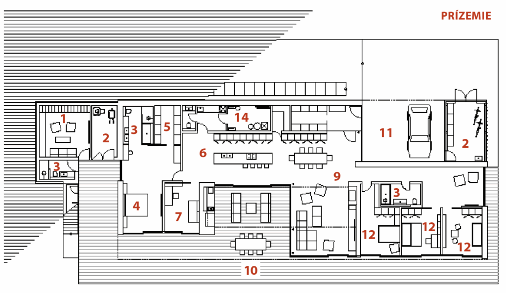 1 vinotéka, 2 sklad, 3 kúpeľňa, 4 spálňa, 5 šatňa, 6 kuchyňa, 7 pracovňa, 8 zádverie, 9 obývacia hala, 10 terasa, 11 parkovacie miesto, 12 izba, 13 sklad, 14 technická miestnosť