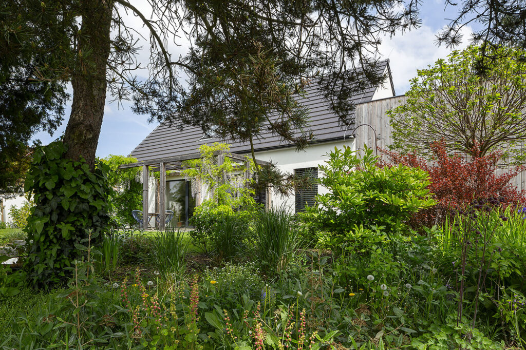 Dom je zvláštny svojou schopnosťou spojiť praktickosť s estetikou: veľké okná prepúšťajú do interiéru množstvo svetla. Presvetľujú centrálne obytné priestory a zároveň poskytujú pohľady do záhrady, ktorú si majitelia sami navrhli a založili. Fasádu do záhrady zdobí jednoduchá pergola – počas letných mesiacov obrastá bohatou zeleňou, takže dodáva terase tieň, čo prispieva k celkovej pohode.
