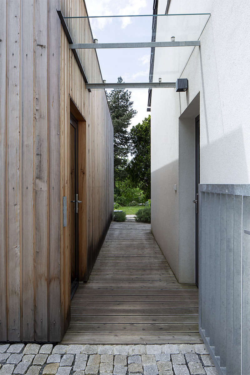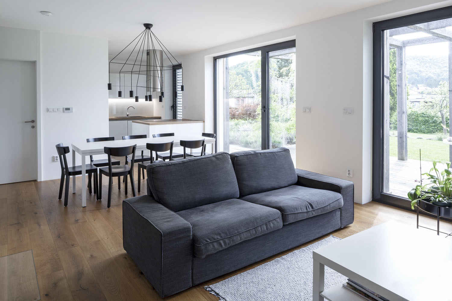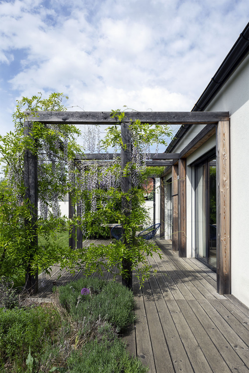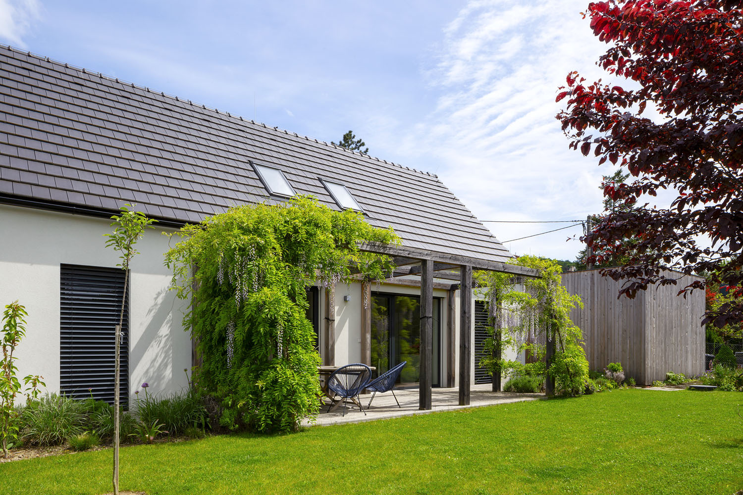 Dom je zvláštny svojou schopnosťou spojiť praktickosť s estetikou: veľké okná prepúšťajú do interiéru množstvo svetla. Presvetľujú centrálne obytné priestory a zároveň poskytujú pohľady do záhrady, ktorú si majitelia sami navrhli a založili. Fasádu do záhrady zdobí jednoduchá pergola – počas letných mesiacov obrastá bohatou zeleňou, takže dodáva terase tieň, čo prispieva k celkovej pohode.