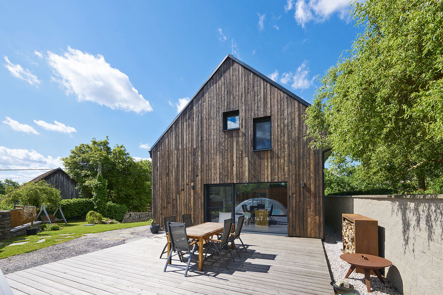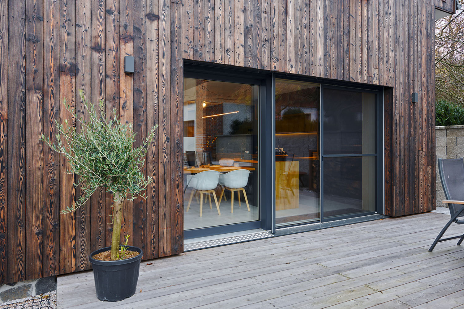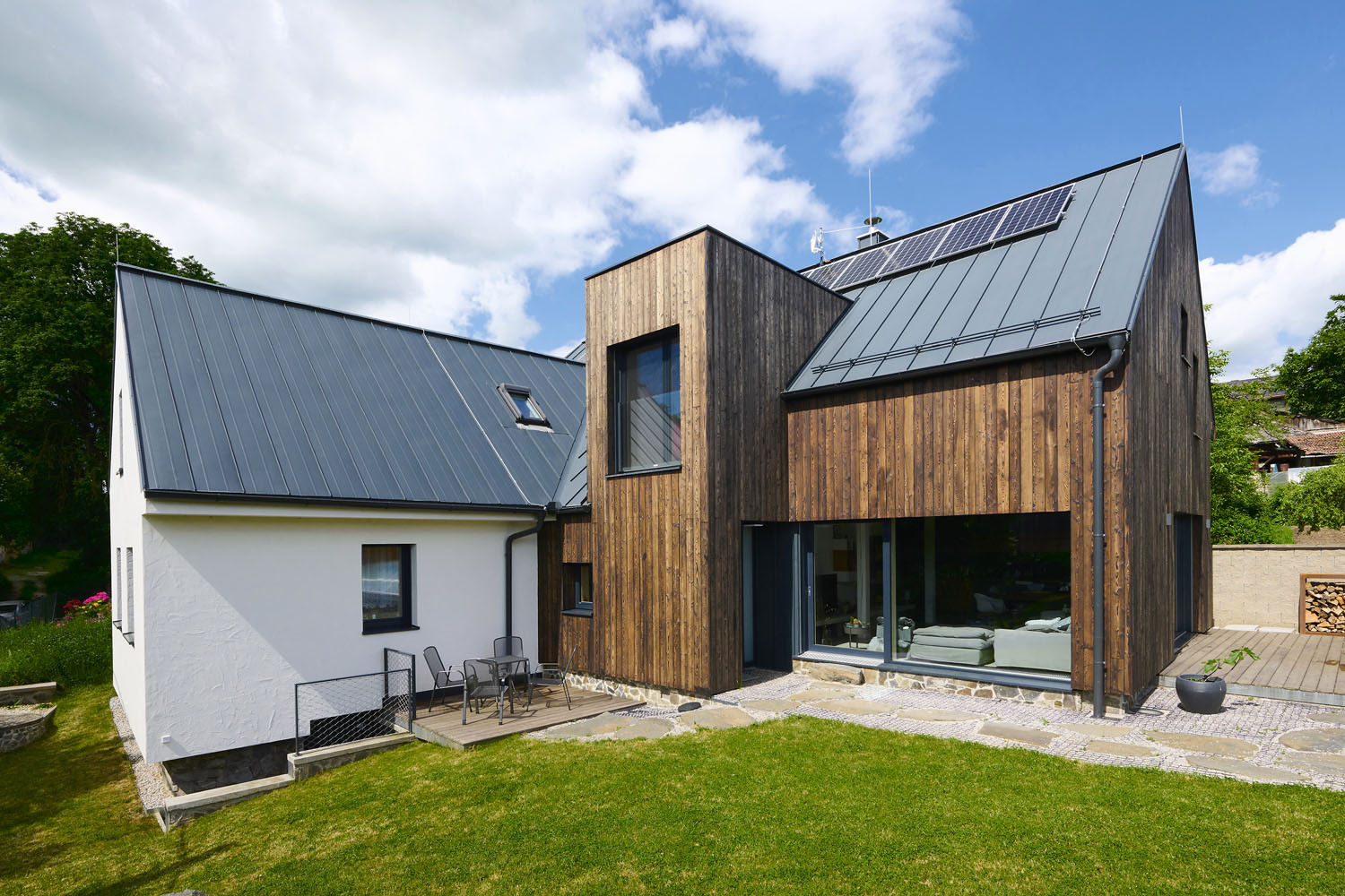 - Fasádny obklad: existujúci dom má fasádnu štruktúrovanú omietku na podkladových doskách na rošte s pôvodným kamenným soklom. Nová časť má fasádny obklad z opaľovaného dreva