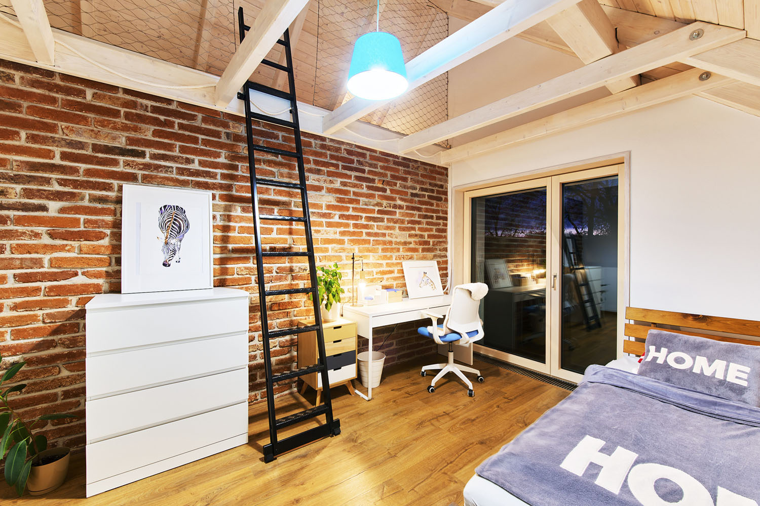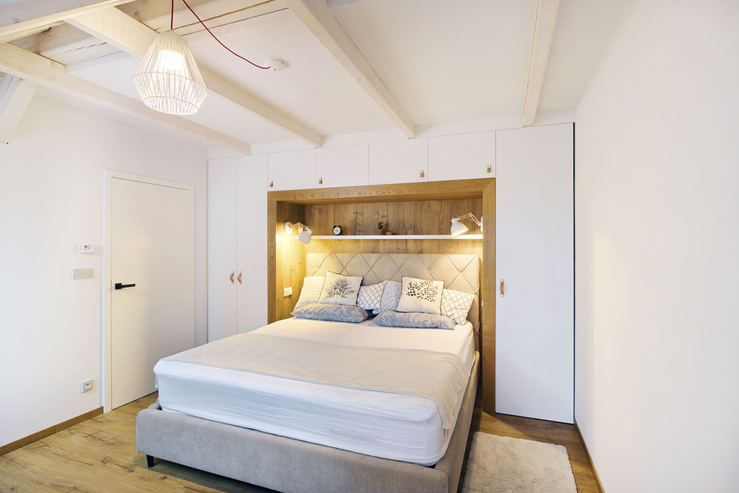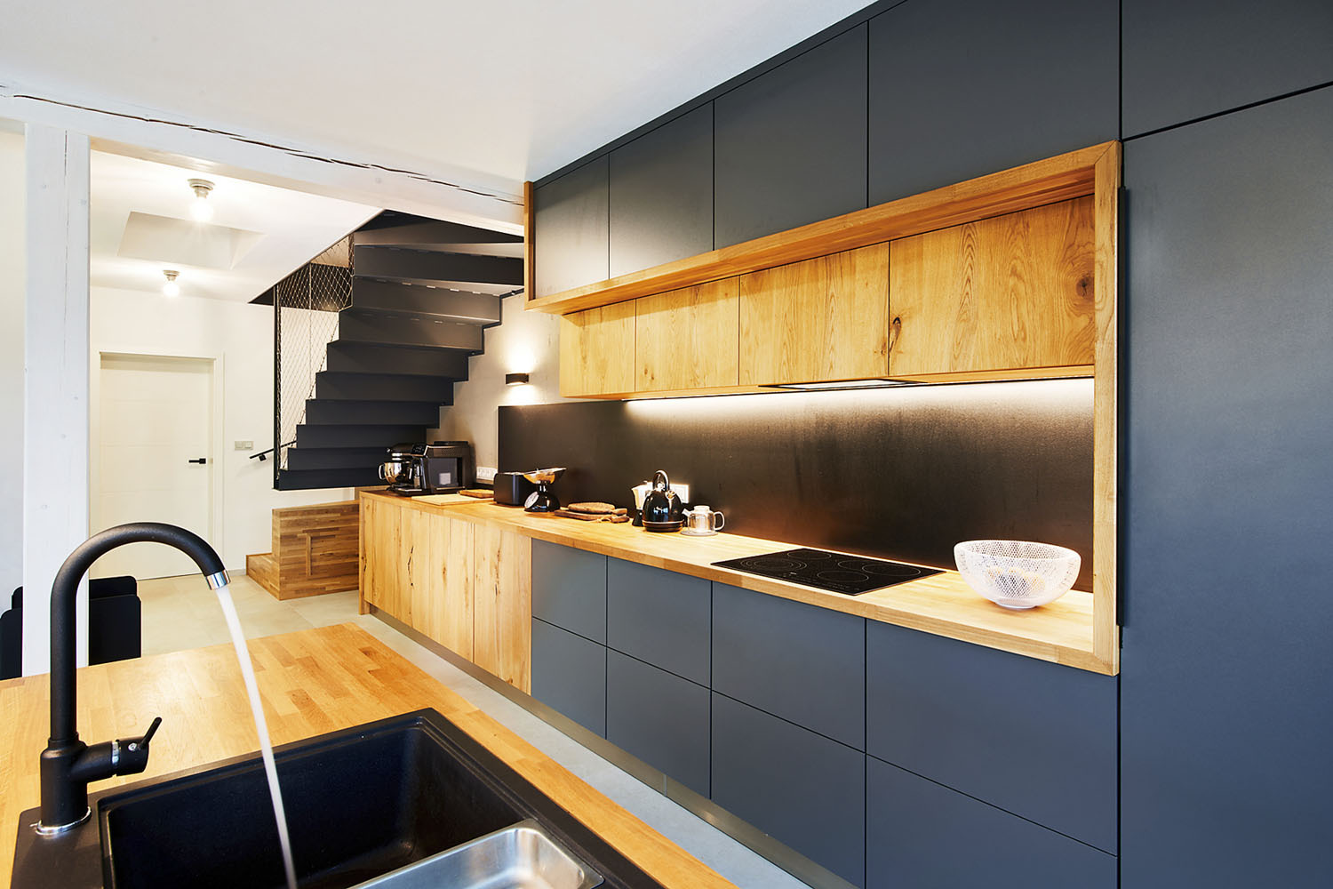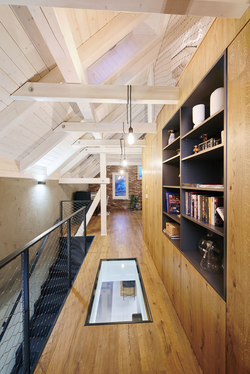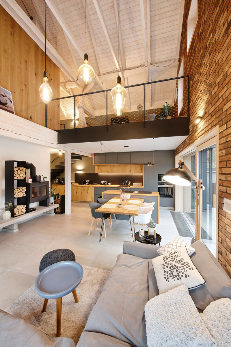 Zámerom bolo nechať čo najviac vyniknúť samotný priestor, kde dominuje priznaná konštrukcia krovu s palubovkami vo svetlom odtieni. Podlahy tvorí keramická dlažba a drevené plávajúce podlahy. Kuchyňa, vstavané skrine a obklady sú realizované kombináciou dreveného dekoru a lamina v antracitovom odtieni. Vnútorné schodisko je z oceľového zváraného plechu v práškovej antracitovej farbe. Oceľové zábradlie je doplnené sieťou z nehrdzavejúcej ocele.