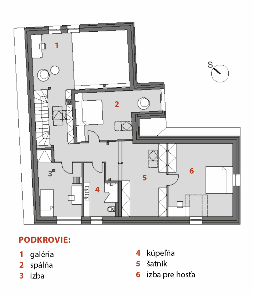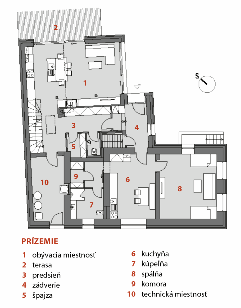 Jednopodlažný dom s podkrovím na pôdoryse písmena L pozostáva z dvoch častí so spoločným vstupom a zázemím. Jedna časť je určená pre stavebníka a druhá pre jeho rodičov. V rámci pôdorysu stavby sa nachádzajú dve existujúce pivnice, ktoré boli zachované. Do rodinného domu vstupujeme cez zádverie, z ktorého vedú dvere do pôvodnej pivnice. Rovnako od vchodových dverí sa vstupuje do časti rodičov, ktorá sa nachádza v pôvodnom domčeku. Tu má svoje miesto kuchyňa s jedálňou, izba a hygienické zariadenie. Ďalšími dverami zo zádveria sa dostaneme do novo riešenej časti, kde je byt stavebníka. Na zádverie nadväzuje chodba so vstupom do WC, špajze a do obytnej miestnosti s kuchynským kútom. Pred nástupom na schodisko je technická miestnosť. V podkroví sa nachádza galéria s priehľadom do obytnej miestnosti na prízemí, spálňa, izba, kúpeľňa, šatňa a izba pre hosťa. Nad spálňou je ešte voľný priestor prístupný po pristavenom rebríku, kde môžu prespať návštevy, prípadne relaxovať obyvatelia domu.