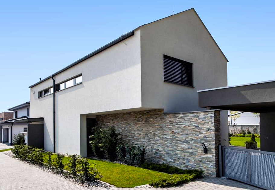 Odvetraná fasáda z kameňa vyzerá minimalisticky a masívne, čím dodáva domu nadčasový vzhľad (ODVETRANA FASADA)