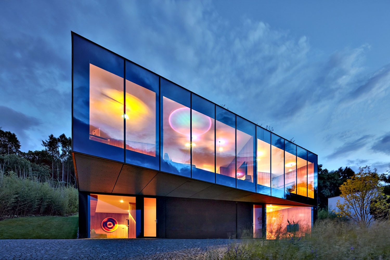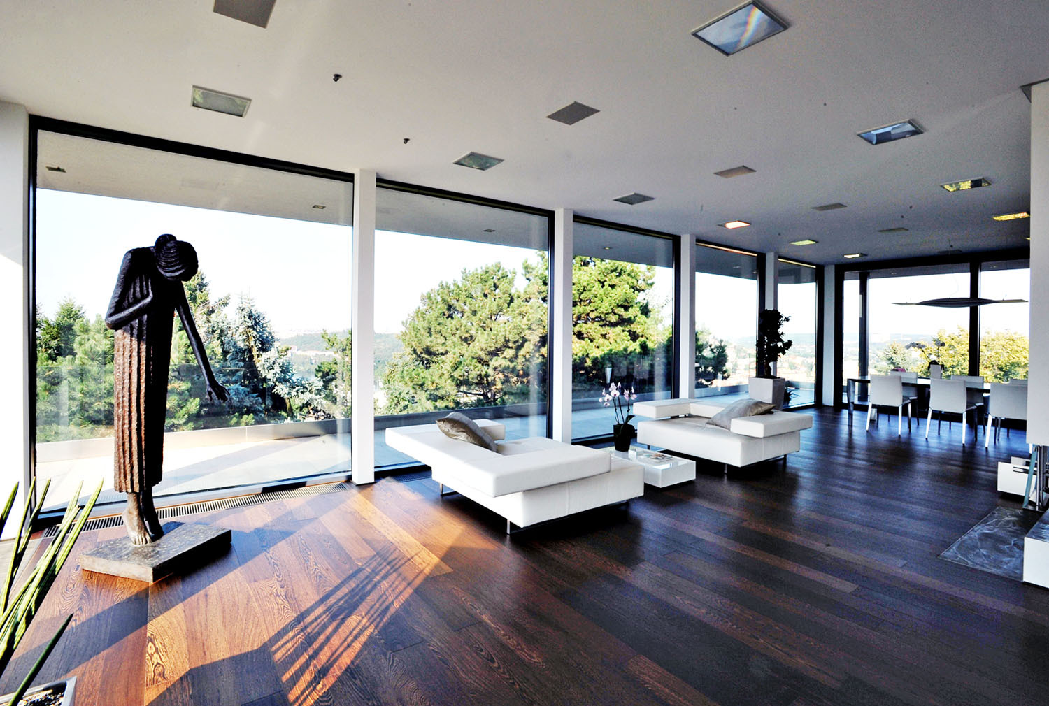 Ak chcete vytvoriť presklenú fasádu v miestnostiach so štandardnou výškou stropu (do 270 cm), postačí jedna veľkoformátová sklená tabuľa (prípadne rad horizontálnych tabúľ) v ráme, ktorý je kotvený do muriva a stropu. Pripojovacia škára sa upravuje ako pri bežných oknách. Veľmi obľúbené sú rohové okná, v takom prípade možno použiť rohový stĺpik (spravidla oceľový profil) alebo lepený rohový spoj skiel. Rohové okno dodá interiéru viac svetla ako štandardné fasádne a navyše vám otvorí nebývalú šírku výhľadu s uhlom 180 stupňov a viac. Pevne zasklené okno môže mať rám drevený, plastový aj hliníkový. Maximálna veľkosť takého okna je daná maximálnou veľkosťou tabule daného typu skla, únosnosťou zvoleného profilu a ďalej dostupnosťou pre montážnu techniku. Dvojsklá a trojsklá dostupné na našom trhu dosahujú dĺžku 4 až 5 m. Veľké okno s trojsklom máva hmotnosť aj viac ako 500 kg, takže už pri návrhu domu treba premyslieť, akým spôsobom sa bude osadzovať (napríklad fasáda domu vo svahu alebo presklenie vo vyšších podlažiach budú vyžadovať použitie žeriavu). Ak chcete vytvoriť súvislú presklenú plochu vo vysokom priestore, napríklad na schodisku, v obývacej izbe otvorenej do druhého podlažia či podkrovia, treba vytvoriť nosný raster, do ktorého sa sklené tabule osadia. Taká konštrukcia „nesie“ veľkú hmotnosť okien a zaisťuje odolnosť veľkej sklenej plochy proti namáhaniu bočným vetrom a proti možným tvarovým deformáciám. Pri rodinných domoch sa obvykle navrhuje individuálne, väčšinou z valcovaných oceľových profilov, a možno ju prispôsobiť atypickým tvarom, napríklad presklenému štítu pod šikmou strechou a pod. Alternatívu ponúkajú niektorí výrobcovia hliníkových okien a fasád, ktorí dodávajú preverené systémové riešenia. Tie sú vhodné predovšetkým pre kancelárie, športové haly, školy či iné veľké objekty. Objavujú sa požiadavky na celé presklené štíty, pásové okná alebo napríklad štrukturálne rohy. V skutočnosti to je vždy určitý kompromis medzi konštrukčnými a realizačnými možnosťami, cenou a predstavou investora. Používanie pevného zasklenia má svoje špecifiká, na ktoré treba pri návrhu pamätať. Konštrukcia výplne otvorov musí byť schopná požadované zasklenie uniesť. Rozmerné a ťažké prvky musí byť možné dopraviť na miesto. Zasklenie musí byť prístupné, ak by ho v budúcnosti bolo potrebné vymeniť. Do úvahy treba brať aj bezpečnostné hľadisko a tepelný komfort v miestnosti a možnosti účinného zatienenia.