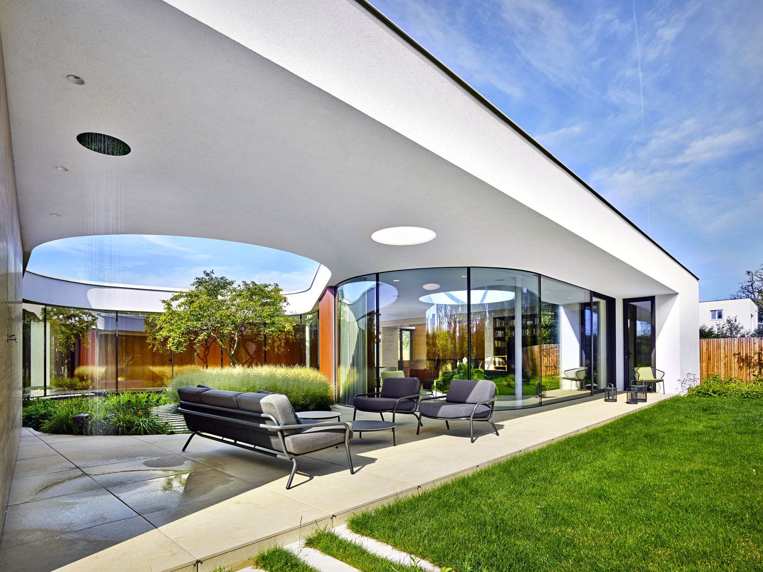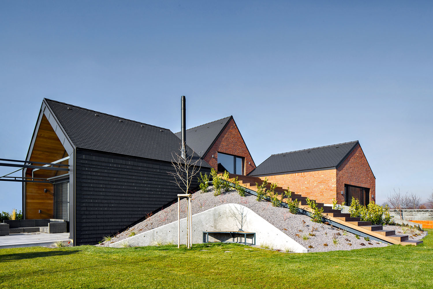 Prepojenie so záhradou – patrí k hlavným dôvodom, prečo si zaobstarať rodinný dom. Obvykle sa realizuje prostredníctvom terasy pri spoločnom obývacom priestore. Na terasu nadväzuje bazén, rekreačný trávnik… (pri dome vo svahu to môže byť inak). Terasa by mala svojou veľkosťou a orientáciou umožniť vonkajšie stolovanie, príjemný výhľad a relaxáciu na slniečku aj v tieni, to všetko v pokoji a v súkromí, chránená pred vetrom, hlukom, pozornosťou susedov a všetkými ďalšími rušivými vplyvmi. Práve odtiaľto plynie veľká obľuba domu v tvare L. Bonusom navyše sú terasy pri spálňach alebo ďalších miestnostiach, prípadne strešné terasy.