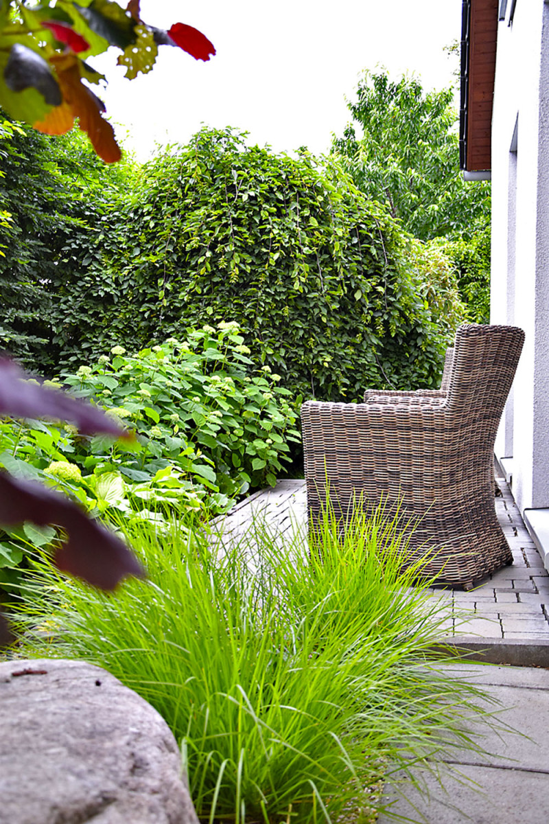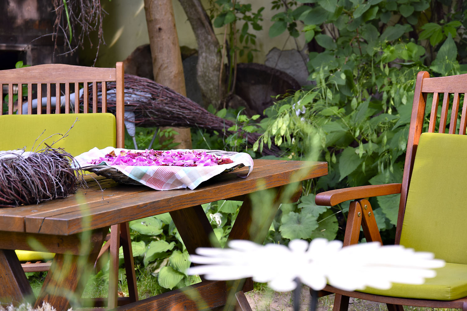 Jednoduchej modernej záhrade pristane umiernený dizajn bez zložitých tvarov. Prírodná záhrada zvládne aj zopár kúskov rustikálneho nábytku.