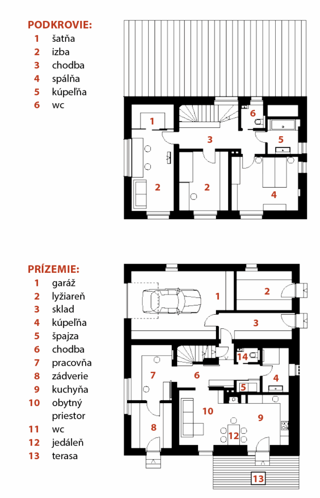 Po úpravách sa úžitková plocha domu rozšírila na takmer 240 m2. Vďaka premyslenému kompaktnému riešeniu poskytuje dosť miesta pre rodinu s tromi deťmi aj na prácu z domova. Pozdĺž južnej fasády na prízemí sa rozlieha spoločný obývací priestor, kde sedenie plynule prechádza do jedálne a ďalej do komfortnej kuchyne s rohovou linkou. Severnú stranu zaberá garáž a nevyhnutné zázemie. Otvorené schodisko vedie do obytnej haly v podkroví, kde sa nachádza spálňa rodičov, kúpeľňa, izba pre dcéru a izba pre synov – presnejšie jej denná časť s dvomi pracovnými stolmi a šatňou. Spanie pre chlapcov je umiestnené v najvyššej časti domu – v priestore pod hrebeňom strechy, kam deti hravo vyšplhajú po rebríku. Majú tú úplné súkromie a nijako nerušia rodičov v spálni ani spoločnosť dole na prízemí. „Niekoľko stavieb sme už zažili a vedeli sme, že nás nečaká nič jednoduché,“ hodnotia majitelia na záver. „Dom sme dôkladne premysleli, pri pohľade spätne nás žiadne veľké prekvapenie nestretlo. Bola to drina, ale výsledok stál za to. Prekvapil skôr našich blízkych – pozitívne. Aj keď sme zachovali maximum z pôvodného domu, výsledný dojem z priestoru bol na nepoznanie.“