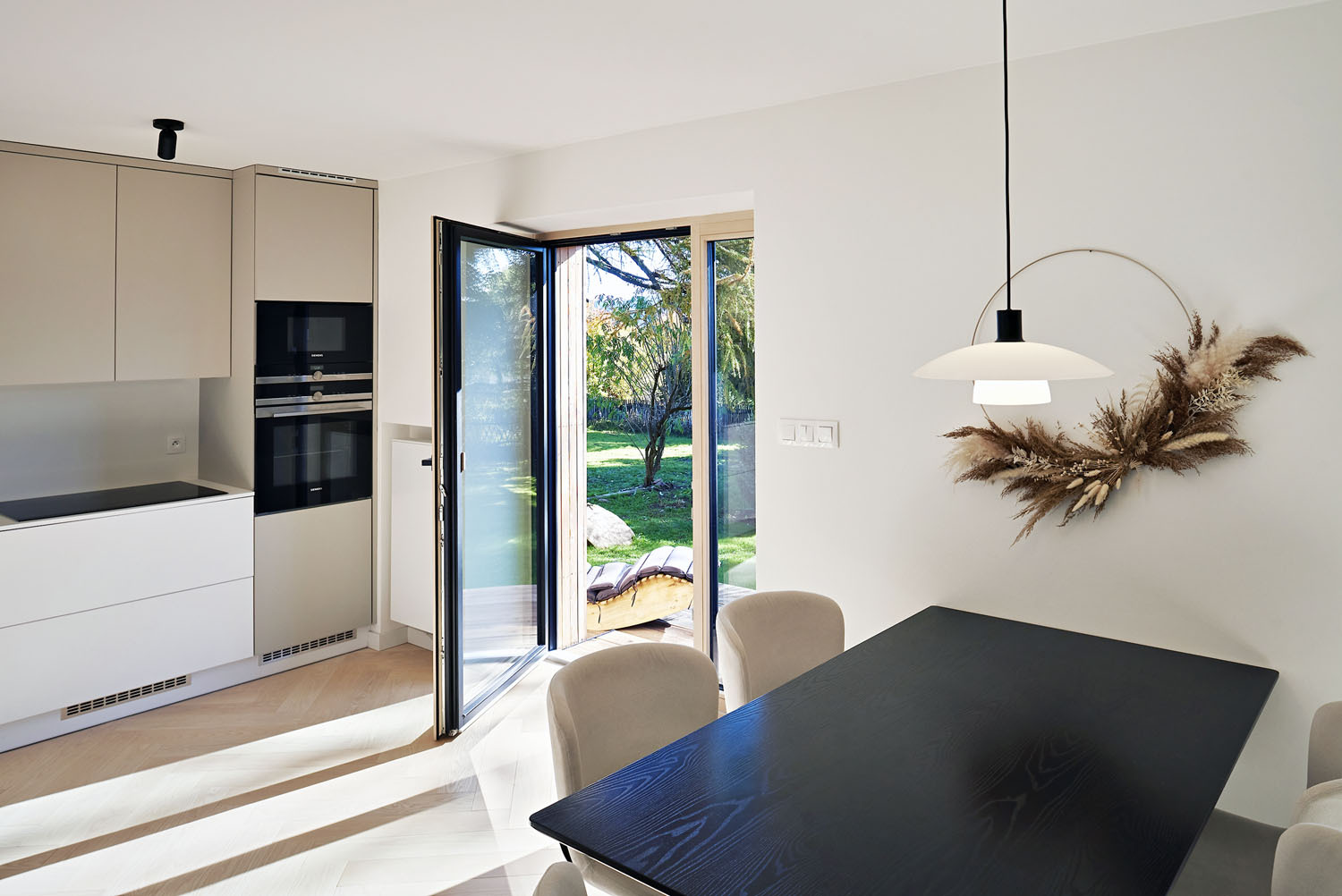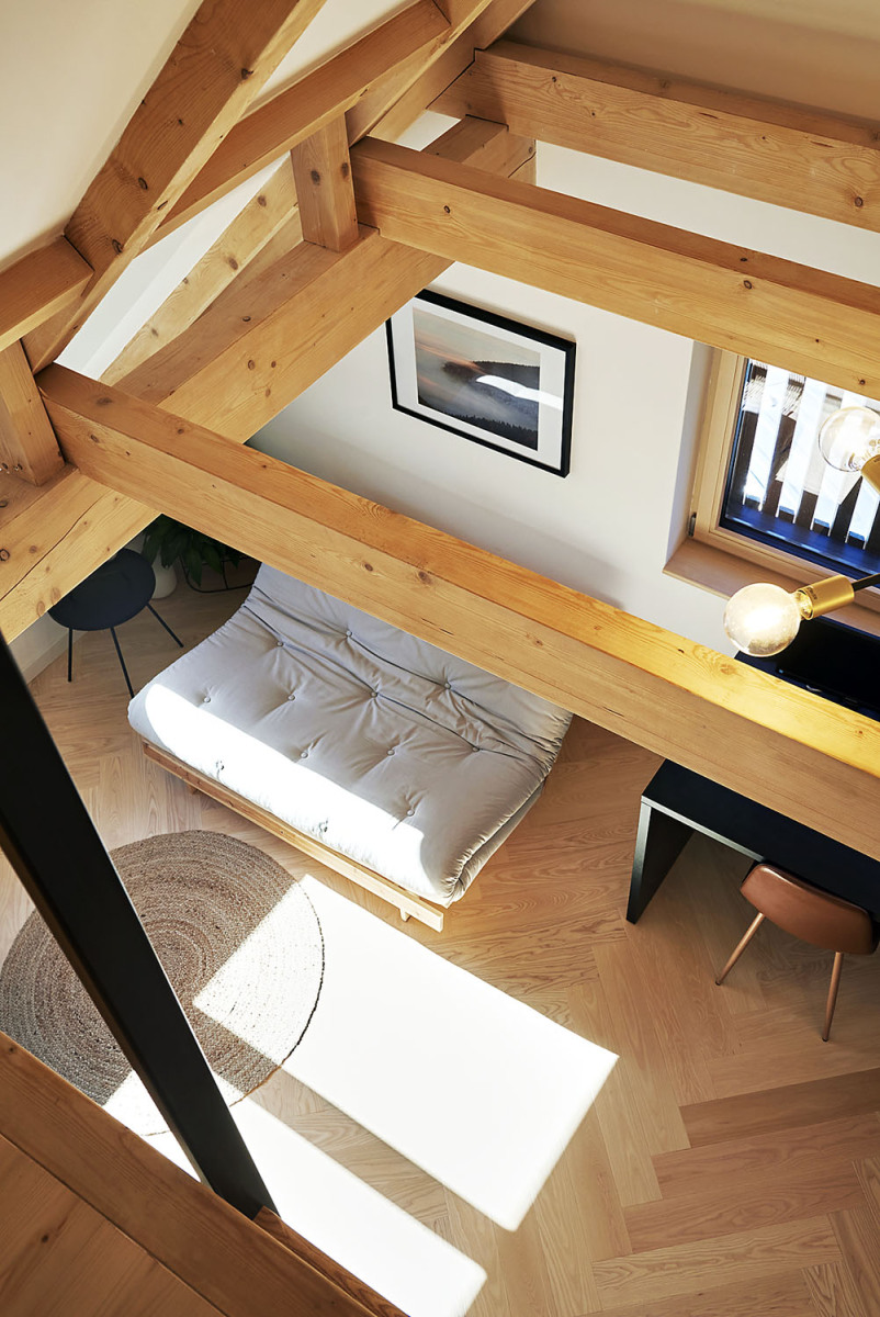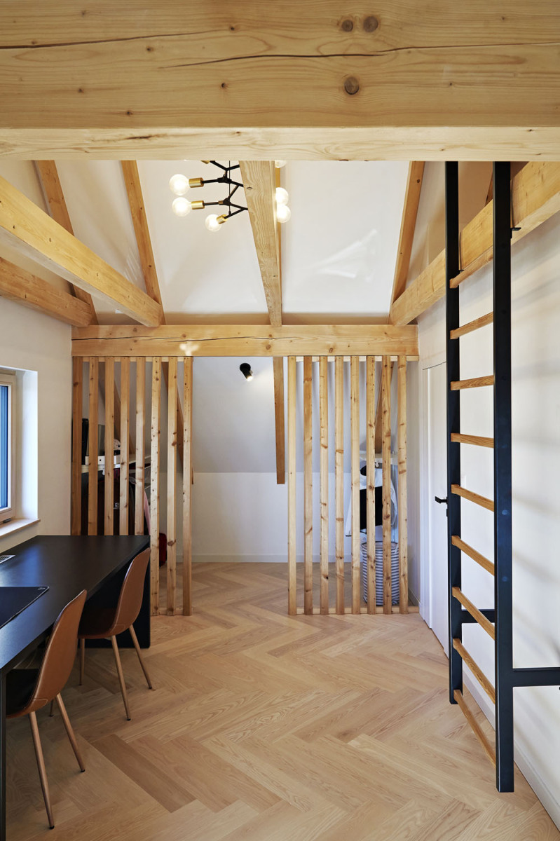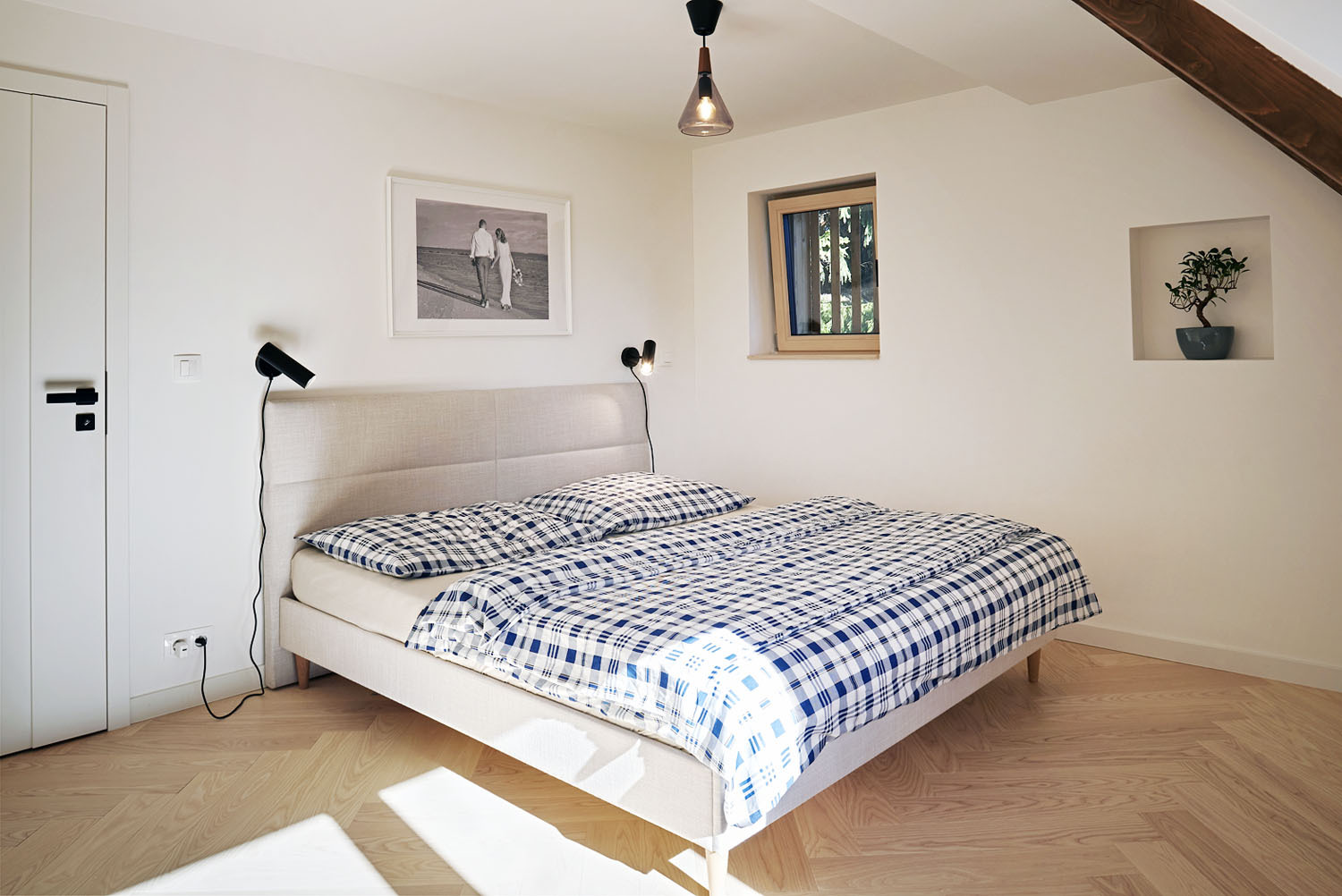 Po úpravách sa úžitková plocha domu rozšírila na takmer 240 m2. Vďaka premyslenému kompaktnému riešeniu poskytuje dosť miesta pre rodinu s tromi deťmi aj na prácu z domova. Pozdĺž južnej fasády na prízemí sa rozlieha spoločný obývací priestor, kde sedenie plynule prechádza do jedálne a ďalej do komfortnej kuchyne s rohovou linkou. Severnú stranu zaberá garáž a nevyhnutné zázemie. Otvorené schodisko vedie do obytnej haly v podkroví, kde sa nachádza spálňa rodičov, kúpeľňa, izba pre dcéru a izba pre synov – presnejšie jej denná časť s dvomi pracovnými stolmi a šatňou. Spanie pre chlapcov je umiestnené v najvyššej časti domu – v priestore pod hrebeňom strechy, kam deti hravo vyšplhajú po rebríku. Majú tú úplné súkromie a nijako nerušia rodičov v spálni ani spoločnosť dole na prízemí. „Niekoľko stavieb sme už zažili a vedeli sme, že nás nečaká nič jednoduché,“ hodnotia majitelia na záver. „Dom sme dôkladne premysleli, pri pohľade spätne nás žiadne veľké prekvapenie nestretlo. Bola to drina, ale výsledok stál za to. Prekvapil skôr našich blízkych – pozitívne. Aj keď sme zachovali maximum z pôvodného domu, výsledný dojem z priestoru bol na nepoznanie.“