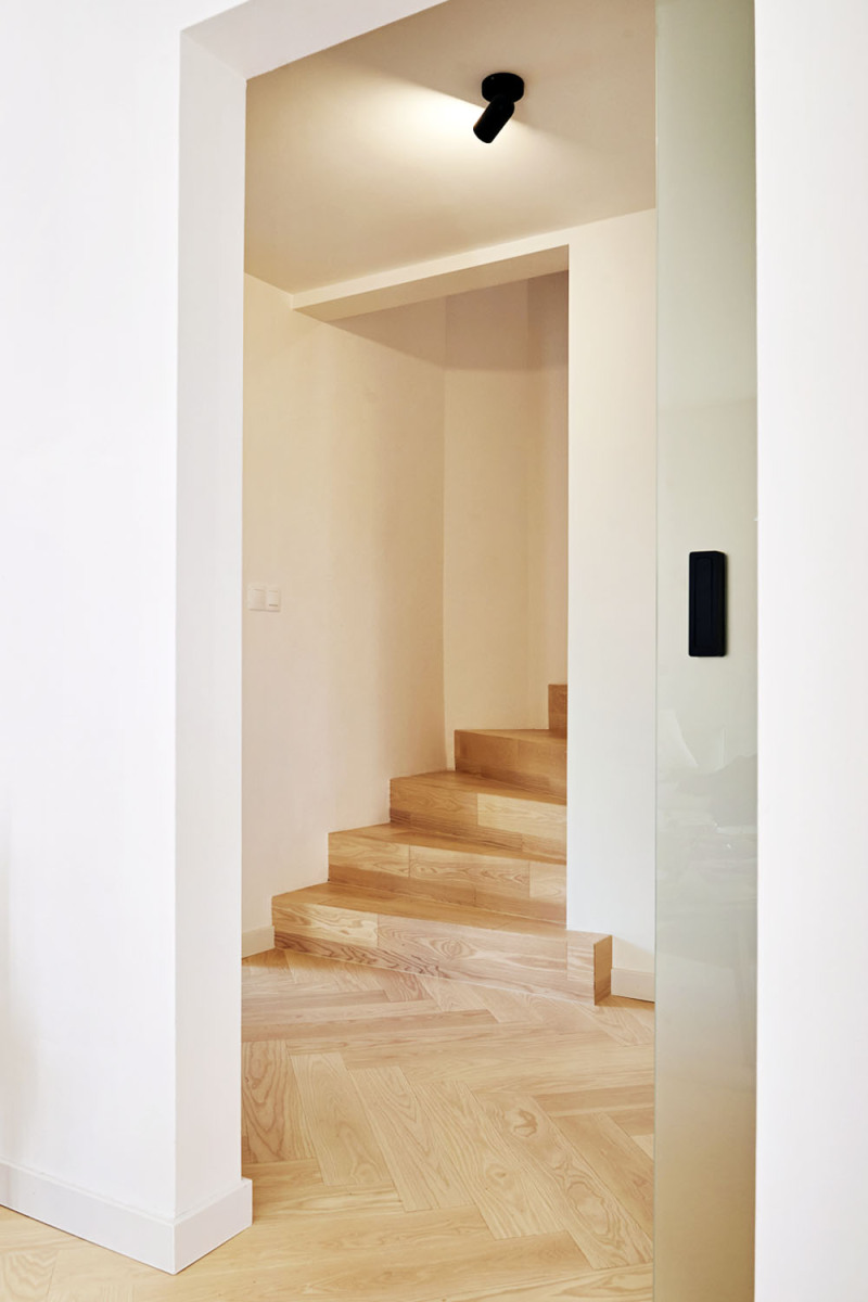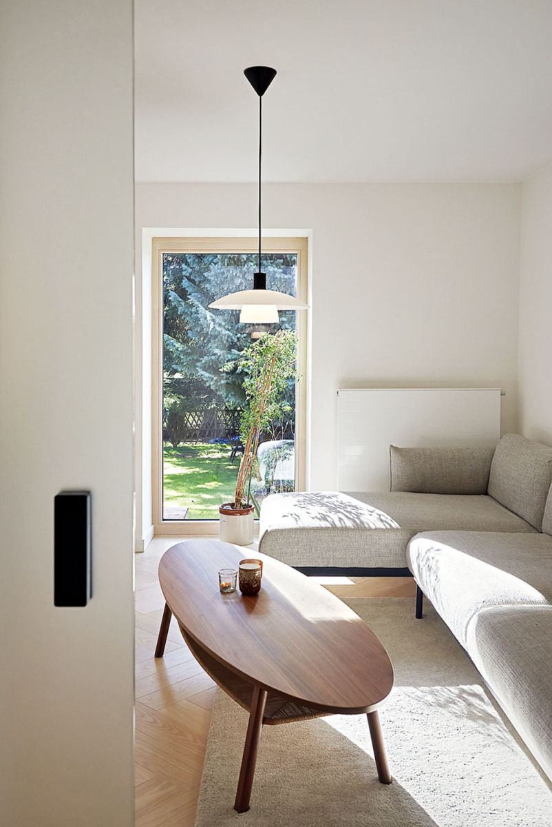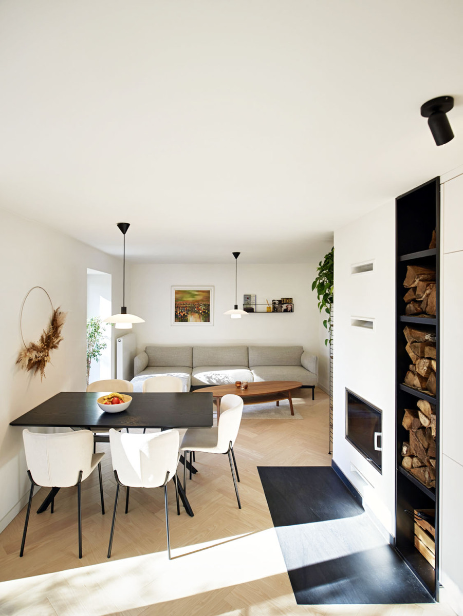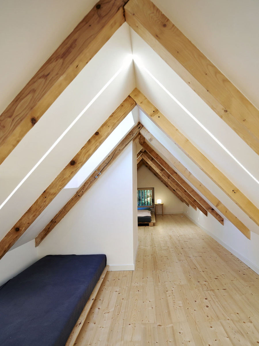 Po úpravách sa úžitková plocha domu rozšírila na takmer 240 m2. Vďaka premyslenému kompaktnému riešeniu poskytuje dosť miesta pre rodinu s tromi deťmi aj na prácu z domova. Pozdĺž južnej fasády na prízemí sa rozlieha spoločný obývací priestor, kde sedenie plynule prechádza do jedálne a ďalej do komfortnej kuchyne s rohovou linkou. Severnú stranu zaberá garáž a nevyhnutné zázemie. Otvorené schodisko vedie do obytnej haly v podkroví, kde sa nachádza spálňa rodičov, kúpeľňa, izba pre dcéru a izba pre synov – presnejšie jej denná časť s dvomi pracovnými stolmi a šatňou. Spanie pre chlapcov je umiestnené v najvyššej časti domu – v priestore pod hrebeňom strechy, kam deti hravo vyšplhajú po rebríku. Majú tú úplné súkromie a nijako nerušia rodičov v spálni ani spoločnosť dole na prízemí. „Niekoľko stavieb sme už zažili a vedeli sme, že nás nečaká nič jednoduché,“ hodnotia majitelia na záver. „Dom sme dôkladne premysleli, pri pohľade spätne nás žiadne veľké prekvapenie nestretlo. Bola to drina, ale výsledok stál za to. Prekvapil skôr našich blízkych – pozitívne. Aj keď sme zachovali maximum z pôvodného domu, výsledný dojem z priestoru bol na nepoznanie.“