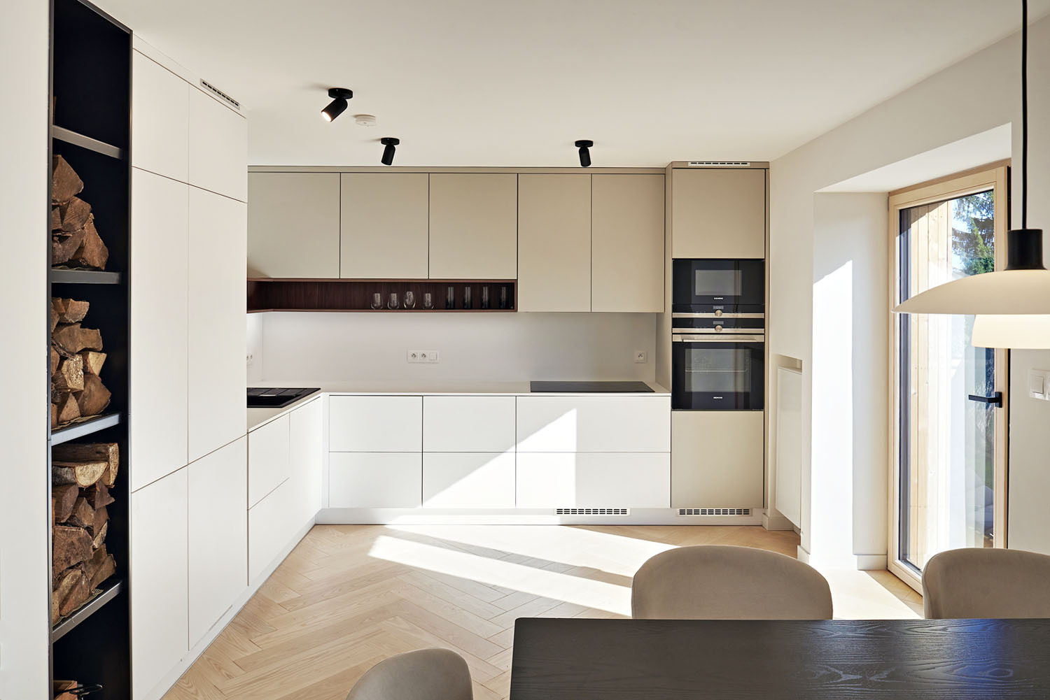 - Výplne otvorov: okná drevené smrekové s tepelnoizolačným trojsklom Ug = 0,6; rámčeky v čiernej farbe; rám okna Uw = 0,8; odtieň okien z exteriéru farba čierna RAL 9004, z interiéru smrek prírodný s povrchovou úpravou bezfarebný matný lak; vonkajšie parapety hliníkové odtieň čierna RAL 9004, vnútorné parapety smrek prírodný s povrchovou úpravou bezfarebný matný lak; interiérové dvere drevené bezfalcové v obložkovej zárubni a posuvné zavesené na koľajnici, garážová brána Hörmann