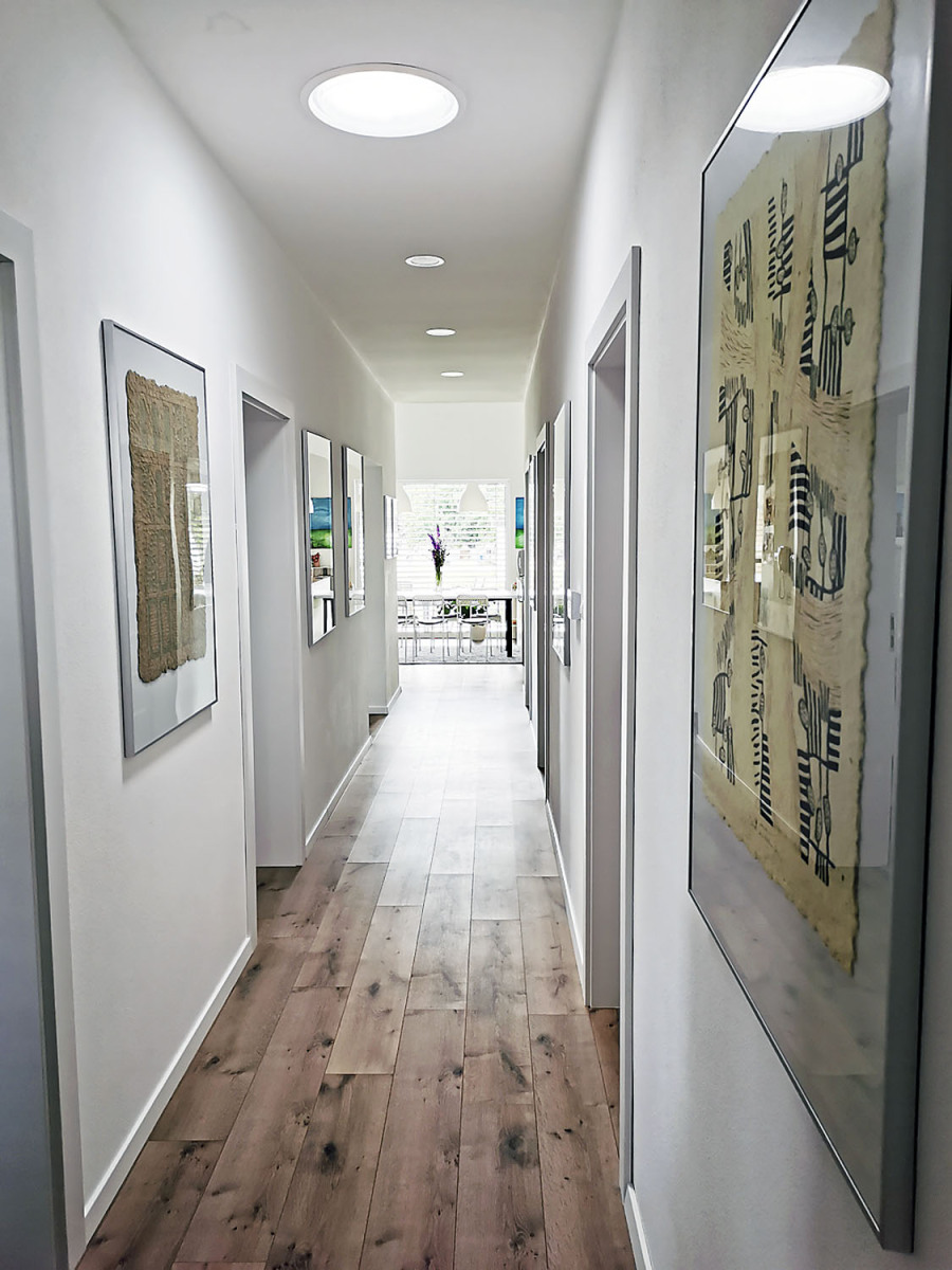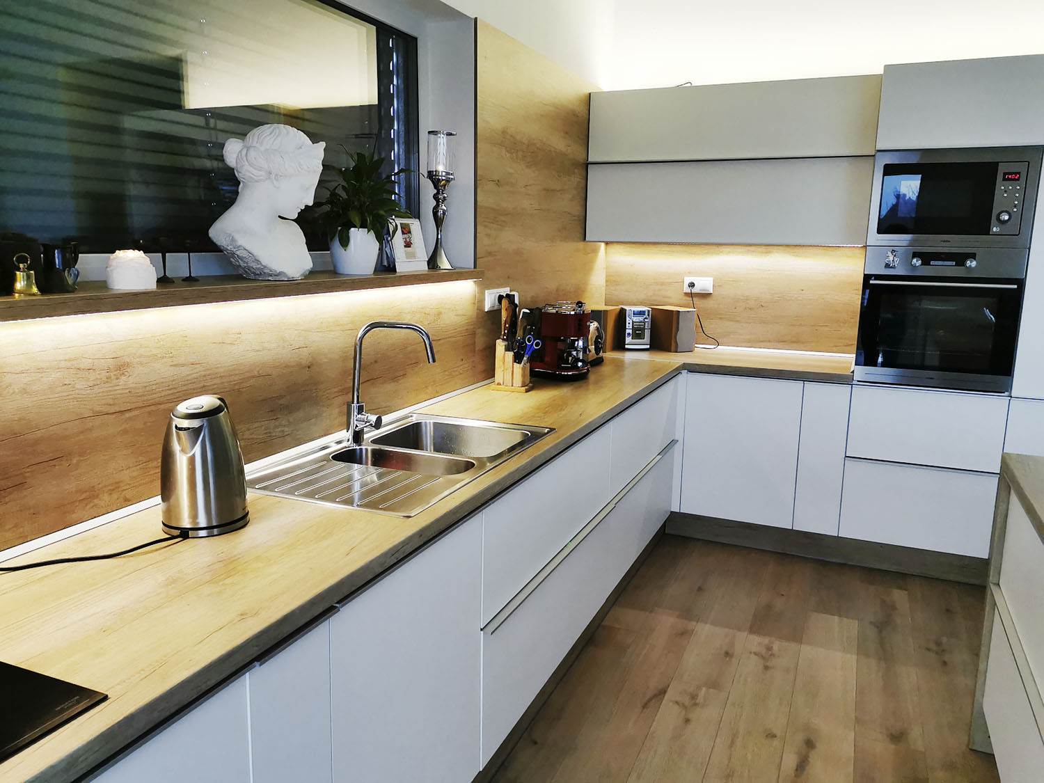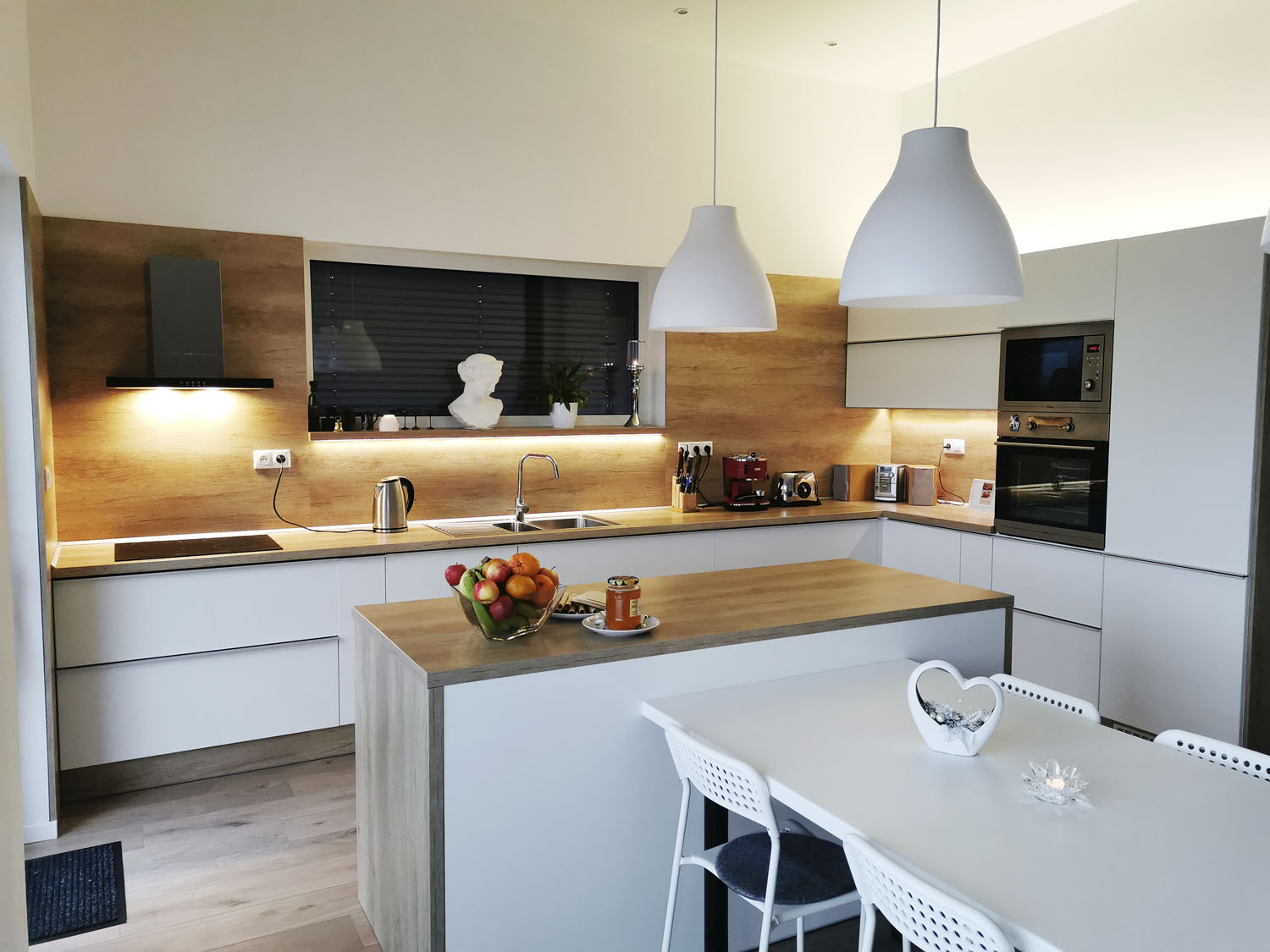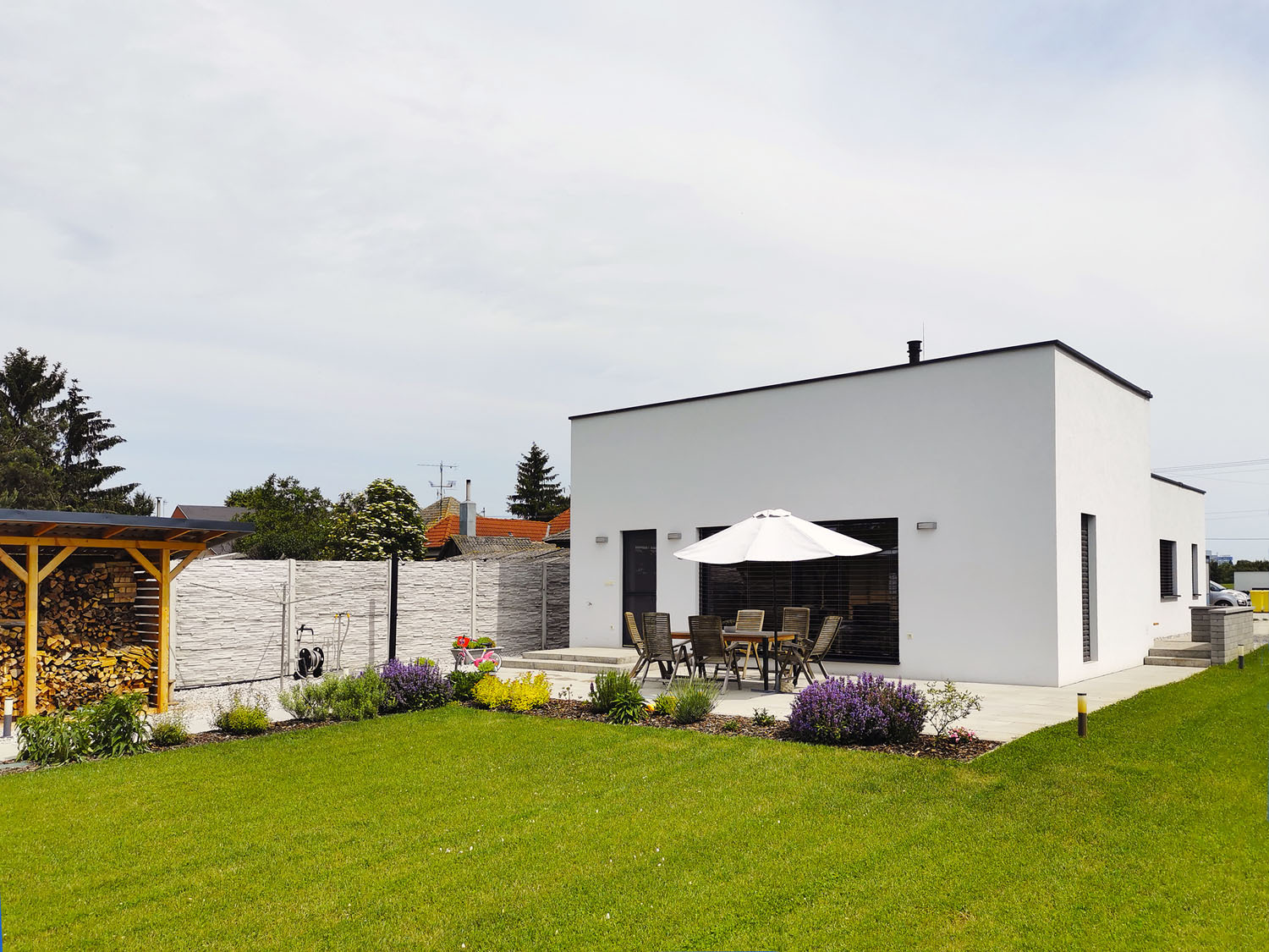 „Mali sme skvelého a trpezlivého architekta pána Ing. arch. Romana Kminiaka a pri stavbe bol pre nás veľmi dôležitý aj Ing. Tibor Viola zo spoločnosti Xella Slovensko. Stavbu domu sme si riadili sami, pomáhala rodina a blízki priatelia. Remeselníkov a firmy, ktoré na dome pracovali, sme vyberali na základe odporúčaní a neváhali sme sadnúť do auta a pozrieť sa na ich prácu. Môžeme len skonštatovať, že sme mali šťastie na ľudí. Korektný prístup a dobre vykonaná práca, bola pre nás radosť potom posúvať kontakt na šikovných ľudí ďalej. Samozrejme, veľa práce sme si urobili sami,“ hovoria manželia Ľudmila a Andrej. Po architektonickej stránke ide o samostatne stojaci jednopodlažný objekt s pôdorysom do písmena „L“, postavený v dvoch úrovniach výšky stropov. Dom je nepodpivničený, s plochou strechou v miernom spáde a je vybavený všetkými druhmi inštalácií. Odbornú, konzultačnú, poradenskú činnosť za spoločnosť Xella Slovensko zabezpečoval Ing. Tibor Viola: „Konštrukčné riešenie rodinného domu tvorí systémové a komplexné riešenie Ytong. Obvodové murivo pozostáva z tvárnic Ytong Lambda YQ 450 mm, vnútorné nosné murivo má hrúbku 250 mm a deliace priečky sú 150 mm hrubé. Plochá strecha rodinného domu je riešená stropnými nosníkmi a stropnými vložkami 200 mm a 250 mm vo dvoch výškových úrovniach. Stavebná realizácia strechy prebehla podľa plánu kladenia Ytong. Riešenie prekladov nad vonkajšími výplňami otvorov je kompletne zrealizované Ytong prekladmi, okrem jedného monolitického prekladu a vnútorného prievlaku medzi obytnou a dennou časťou domu. Rovnako realizácia atiky po obvode plochej strechy je z Ytong tvárnic s hrúbkou 250 mm. Práce spojené s materiálmi Ytong boli od samého začiatku realizované našimi Ytong – majstrami. Naši špecialisti pomáhali investorovi so založením rohov stavby, s vytiahnutím kompletného muriva aj so strechou s atikou.“ K pórobetónu Ytong doviedli majiteľov vylučovacou metódou ich požiadavky na nový dom. „Mali sme jasné kritériá: jednoduchá manipulácia, presnosť tvárnic, nechceli sme zatepľovať, dôležité pre nás bolo zdravé bývanie a Ytong navyše ponúkol ucelený systém. Čo však bolo najdôležitejšie, k týmto našim požiadavkám sa pridal ľudský faktor menom Ing. Tibor Viola, vďaka ktorému sme získali výborné poradenstvo a servis,“ vysvetľujú majitelia.