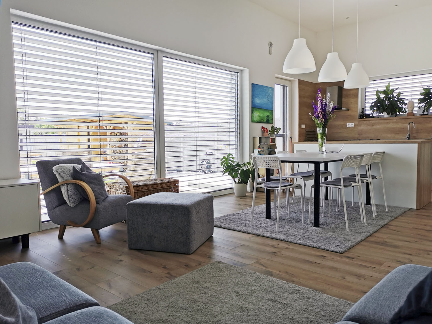 Pôvodná dispozícia domu bola síce pre troch, ale už pri plánovaní domu rodičia mysleli aj na druhé dieťa a súčasne na plnohodnotné bývanie pre každého člena rodiny. Z pôvodne uvažovanej dispozície tak vzniklo súčasné usporiadanie vo forme 4 + kk. Keďže sa na základe svojich kritérií rozhodli pre Ytong, použili ho na celej stavbe: od obvodového muriva, cez priečky až po strechu. „Nakoľko sme sa rozhodli, že dom nebudeme zatepľovať, zvolili sme tvárnice Ytong Lambda YQ 450 mm, doplnené na oknách o vonkajšie žalúzie, ktoré výborne zabraňujú prehrievaniu okien a v zime sú skvelým izolantom.