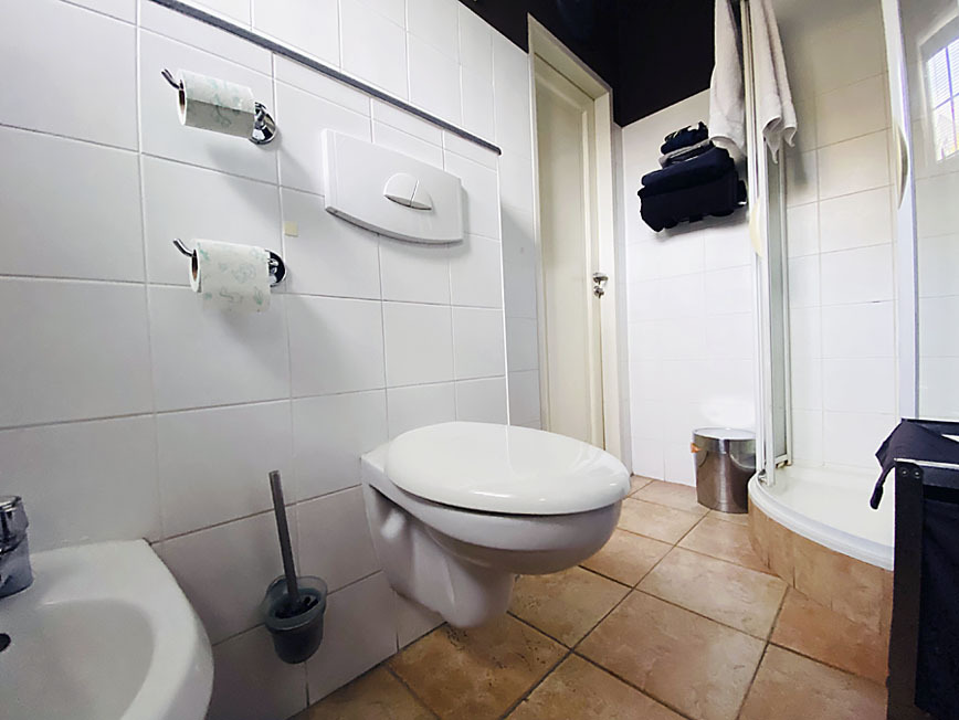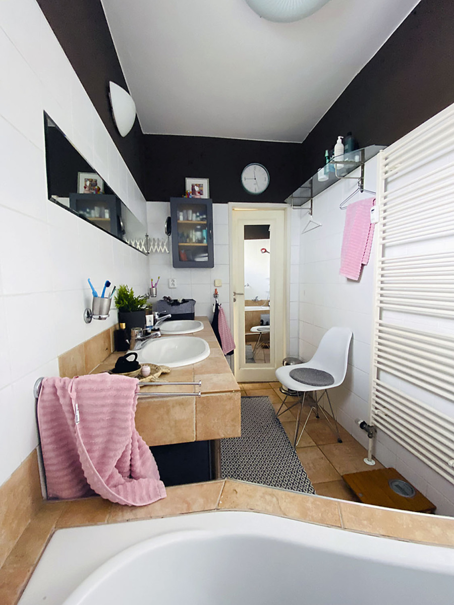 Sociálne zázemie tvoria dve úzke dlhé miestnosti: kúpeľňa s pôdorysom 160 × 300 cm a toaleta 140 × 260 cm. Vybavenie a dizajn zodpovedali trendom a možnostiam druhej polovice deväťdesiatych rokov – obklady v odtieňoch biela a svetlá terakota, ozdobné listely, veľká rohová vaňa, na mieru vyrobený pult s keramickým obkladom, dvoma vsadenými umývadlami, na toalete sprchovací kút so štvrťkruhovou vaničkou, závesné WC a bidet a malé rohové umývadlo. Ponuka sanitárnych predmetov ani kúpeľňového nábytku v tej dobe nebola príliš pestrá, majiteľka nechala vyrobiť u stolára drevené úložné kontajnery a zrkadlovú skrinku. Určitý „refresh“ vybavenia oboch miestností síce počas rokov prebehol – drevený dekor skriniek prekryl šedý náter, redukovali sa doplnky, ale kúpeľňa bola pomerne stiesnená a nepraktická a pôsobila opotrebovane a nevábne. Poslednou kvapkou, ktorá urýchlila rozhodnutie o rekonštrukcii, bol pretekajúci záchod a netesniaci odtok vane.
