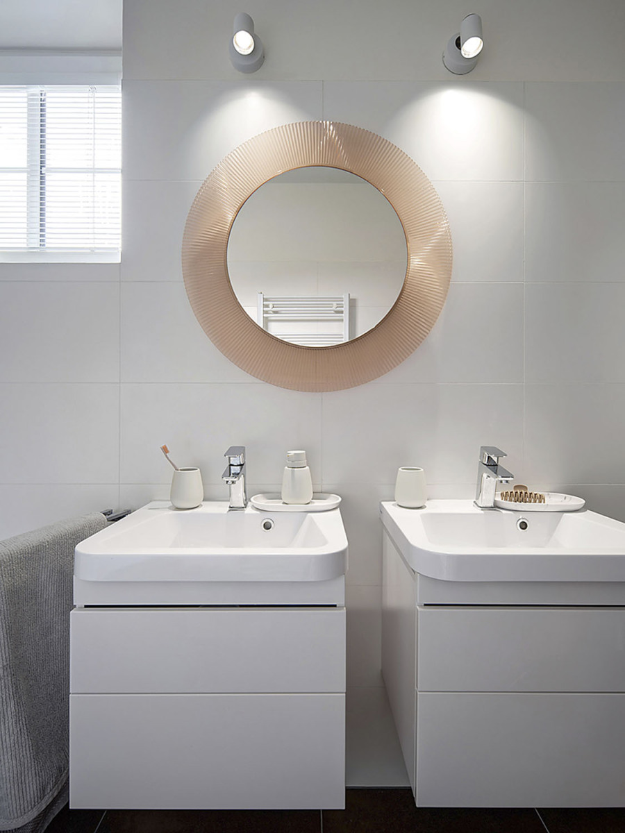 V kúpeľni žiari dizajnový kus, o ktorom majiteľka snívala oveľa skôr, než padlo rozhodnutie o rekonštrukcii – okrúhle zrkadlo v plastovom „plisé“ ráme z kolekcie Kartell by Laufen.