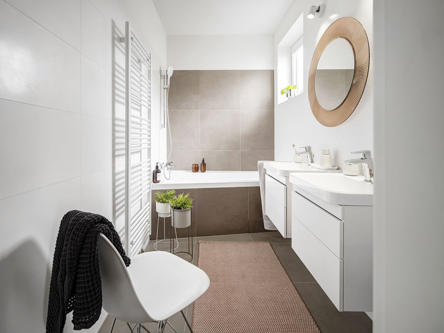 Sanitárne vybavenie zvolili od značky Ravak, a aj v tomto prípade dali prednosť jednoduchosti a bielej farbe. „Dekor dreva by sa mi pravdepodobne čoskoro obkukal. Zopakovali sme umiestnenie zariaďovacích predmetov, preto stačilo v showroome s odborníkom všetko vybrať,“ popisuje majiteľka. Väčšina výrobkov vrátane vane, dvoch nábytkových umývadiel do kúpeľne, vysokej skrinky a chrómovaných doplnkov je z dizajnovej kolekcie 10 stupňov. Zošikmením pozdĺžnej steny vane v uhle 10° je šikovne vyriešené napríklad sedenie a odkladacia plocha.