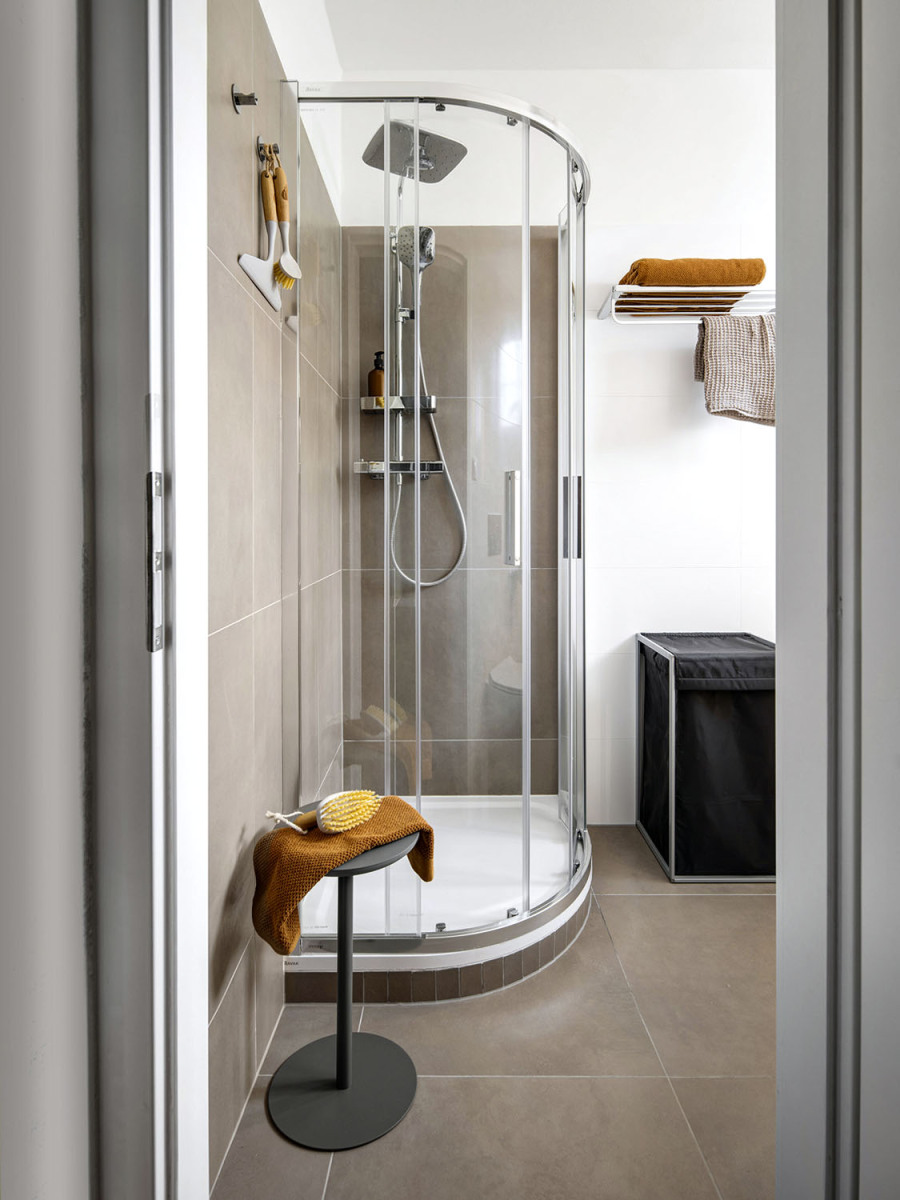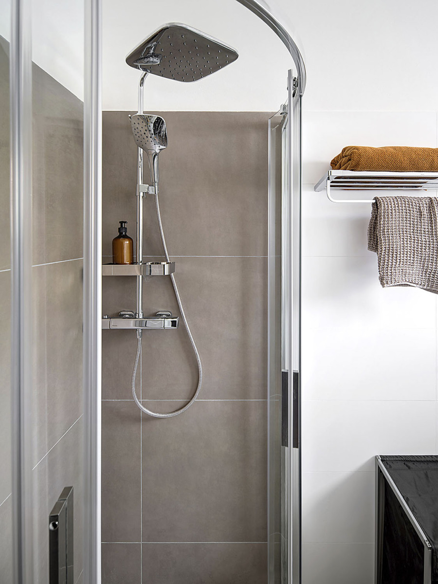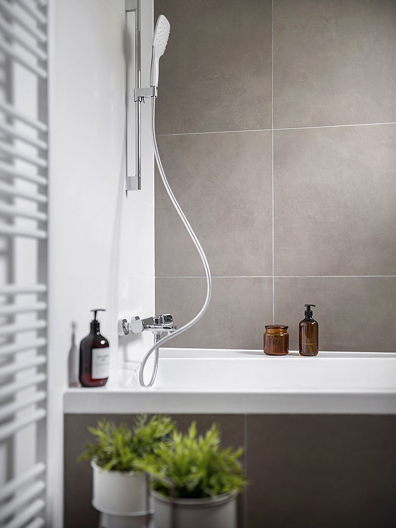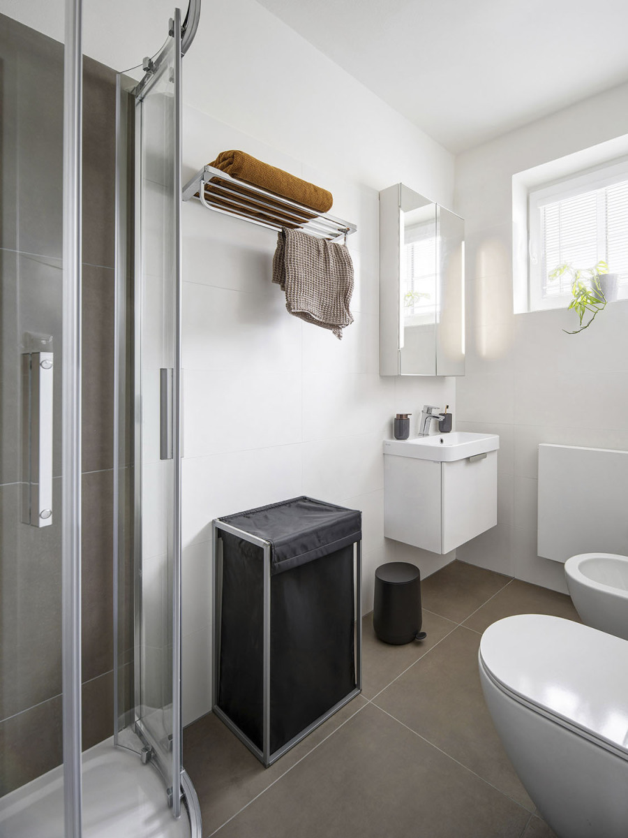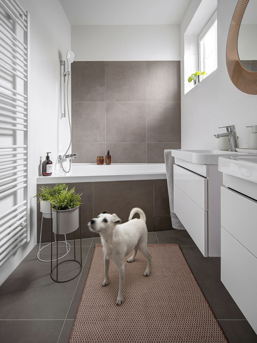 O obkladoch mali majitelia jasnú predstavu: veľký formát, biely základ, žiadne mozaiky ani dekory, neutrálne svetlé farby. Vzhľadom na veľkú šírku ponuky sa výber obkladov a dlažby nakoniec ukázal oveľa náročnejší, než sa spočiatku zdalo. „Po pár návštevách showroomu (domov vždy vybavená inými vzorkami) som získala pocit, že šedá nemá päťdesiat odtieňov, ale aspoň tisíc. Zvíťazila nakoniec séria od Rako v šedohnedom odtieni. To preto, že dlaždice 60 × 60 cm majú ABS povrch, na ktorom sa lomí dopadajúce svetlo a ktorý je príjemný na dotyk aj praktický na upratovanie. Z rovnakej kolekcie je na stene biely zamatovo pôsobiaci obklad 30 × 60 cm,“ približuje majiteľka.